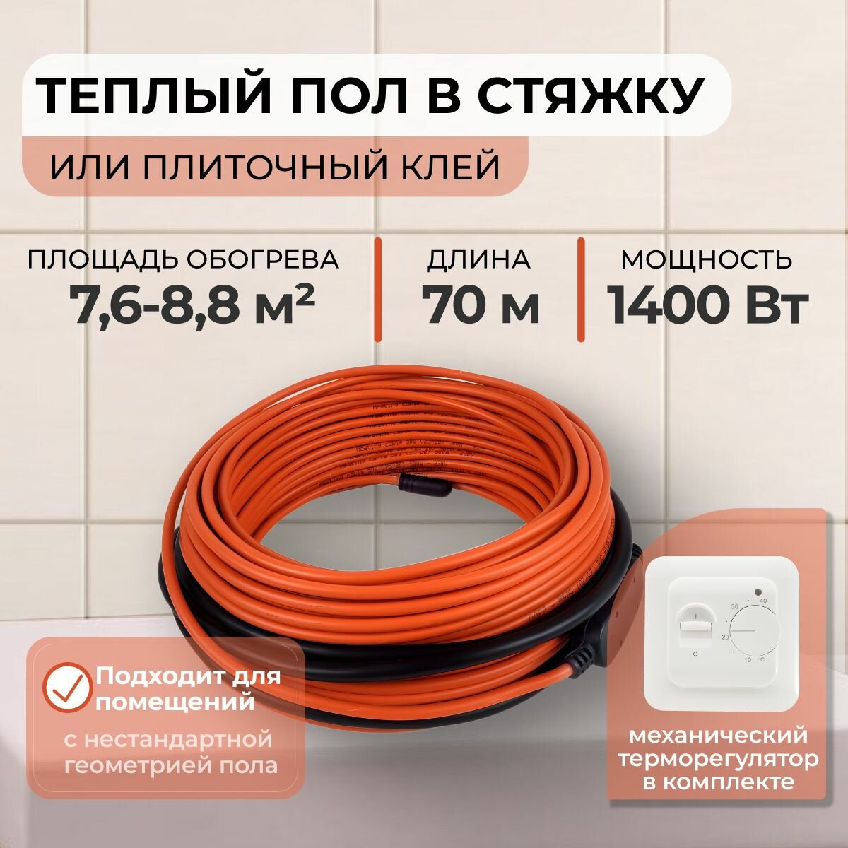 Теплый пол В стяжку или Плиточный клей 1400Вт (7,6-8,8 м.кв.) с механическим терморегулятором