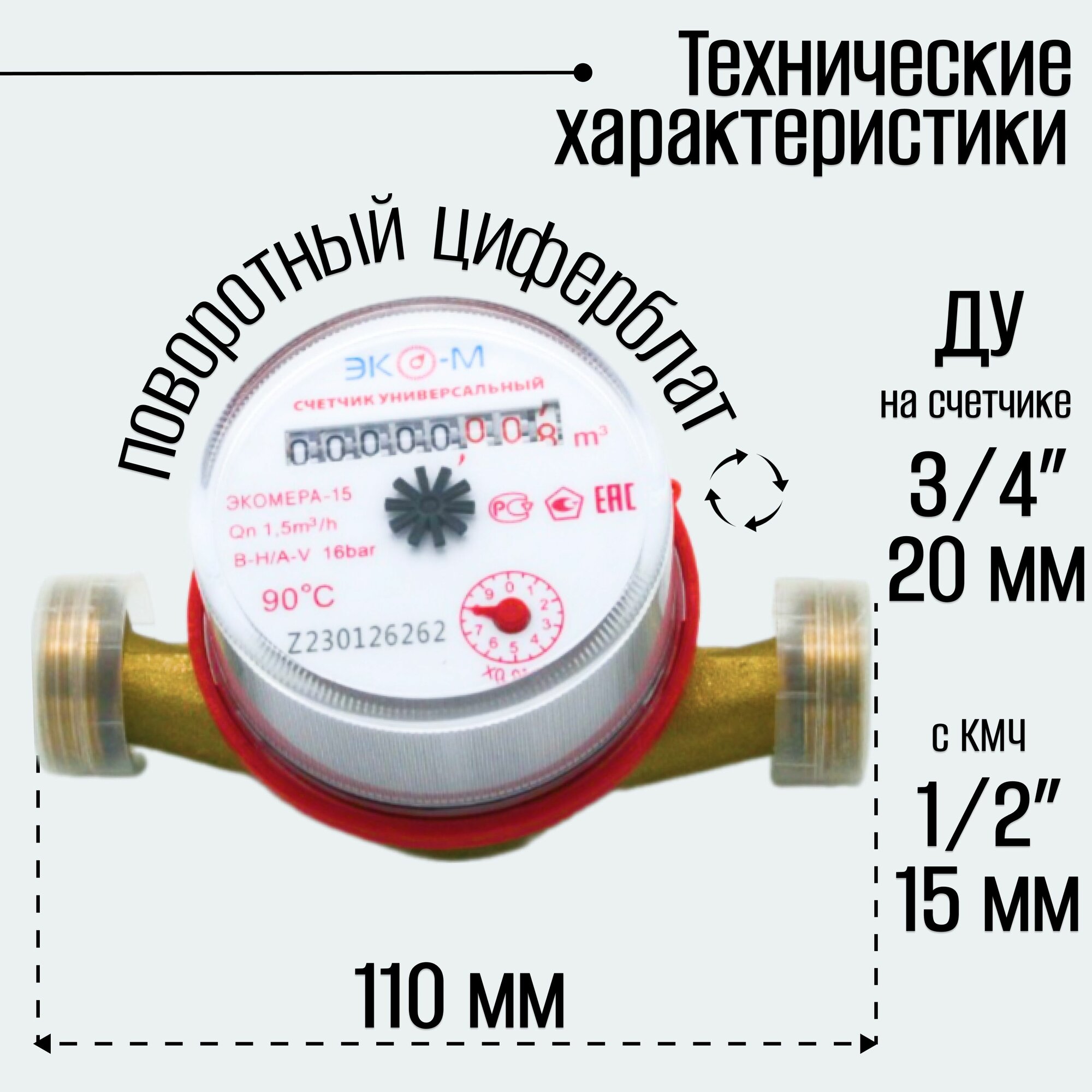 Счетчик воды универсальный Экомера-15 установочная длинна 110 без КМЧ