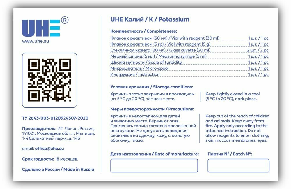 Tест UHE для определения содержания Калия (К),высокоточный 0-25 мг/л для пресной воды.