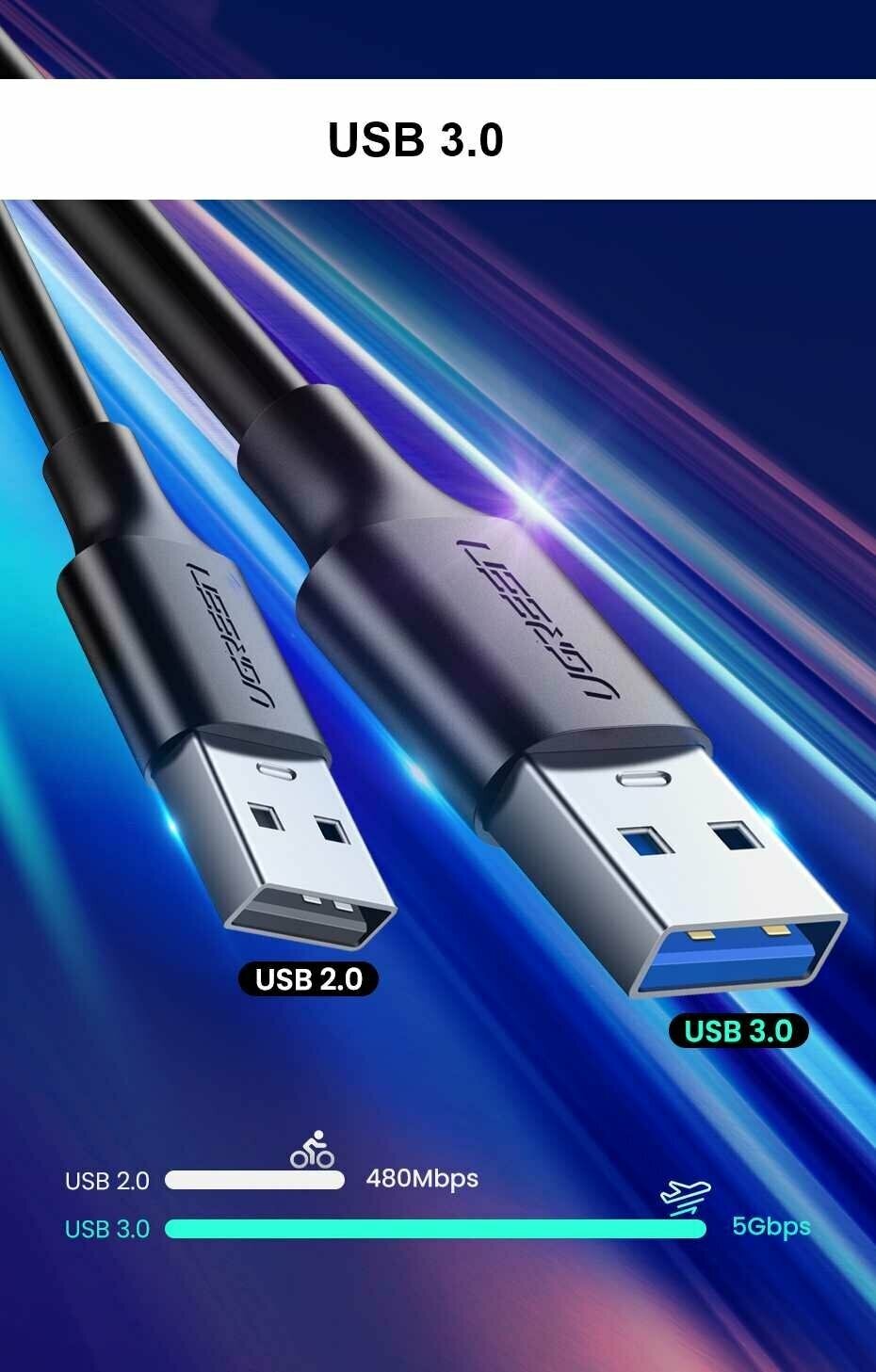 Кабель UGREEN US184 (20884) USB 3.0 A Male to Type C Male Cable Nickel Plating. Длина: 2м. Цвет: черный