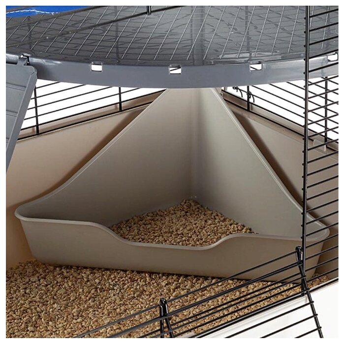 - Высокий поддон, благодаря которому наполнитель не окажется вне клетки, если ваши любимые крысам любят копаться. Кстати, наполнителя много уйдёт, но я засыпаю только в угловой туалет; - Наличие в комплекте углового туалета, поилки (опять же огромная, 600 мл, не воспользуюсь), металлической миски с креплением к решётке, большого гамака; - Горизонтальные прутья решётки с маленьким расстоянием между ними. Крысы-павуки оценили; - Возможность открывать крышу, что облегчает процесс уборки; - Этаж с лестницей большой и хороший. |