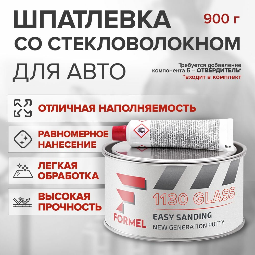 Шпатлевка со стекловолокном для кузова автомобиля FORMEL 1130 0,9 кг / 2К шпатлевка со стекловолокном с отвердителем в комплекте