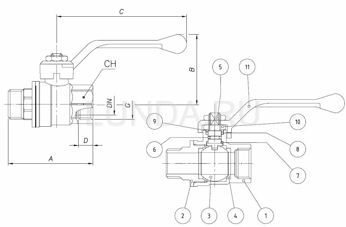 Кран шаровой резьб. 1 1/4", PN25, Bugatti OREGON 305, латунь, вн.р.- нар.р., с рычагом