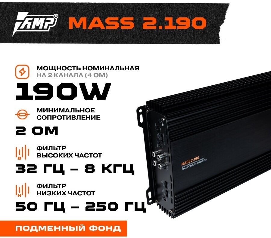 СохранитьУсилитель AMP MASS 2.190 автомобильный, 2-х канальный, класс AB, 1100W интересное: