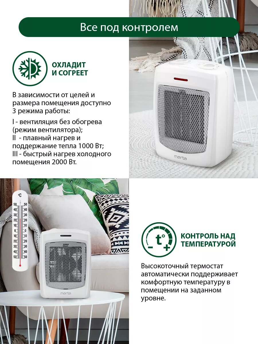 Обогреватель тепловая пушка тепловентилятор MARTA MT-2522 белый жемчуг интересное: