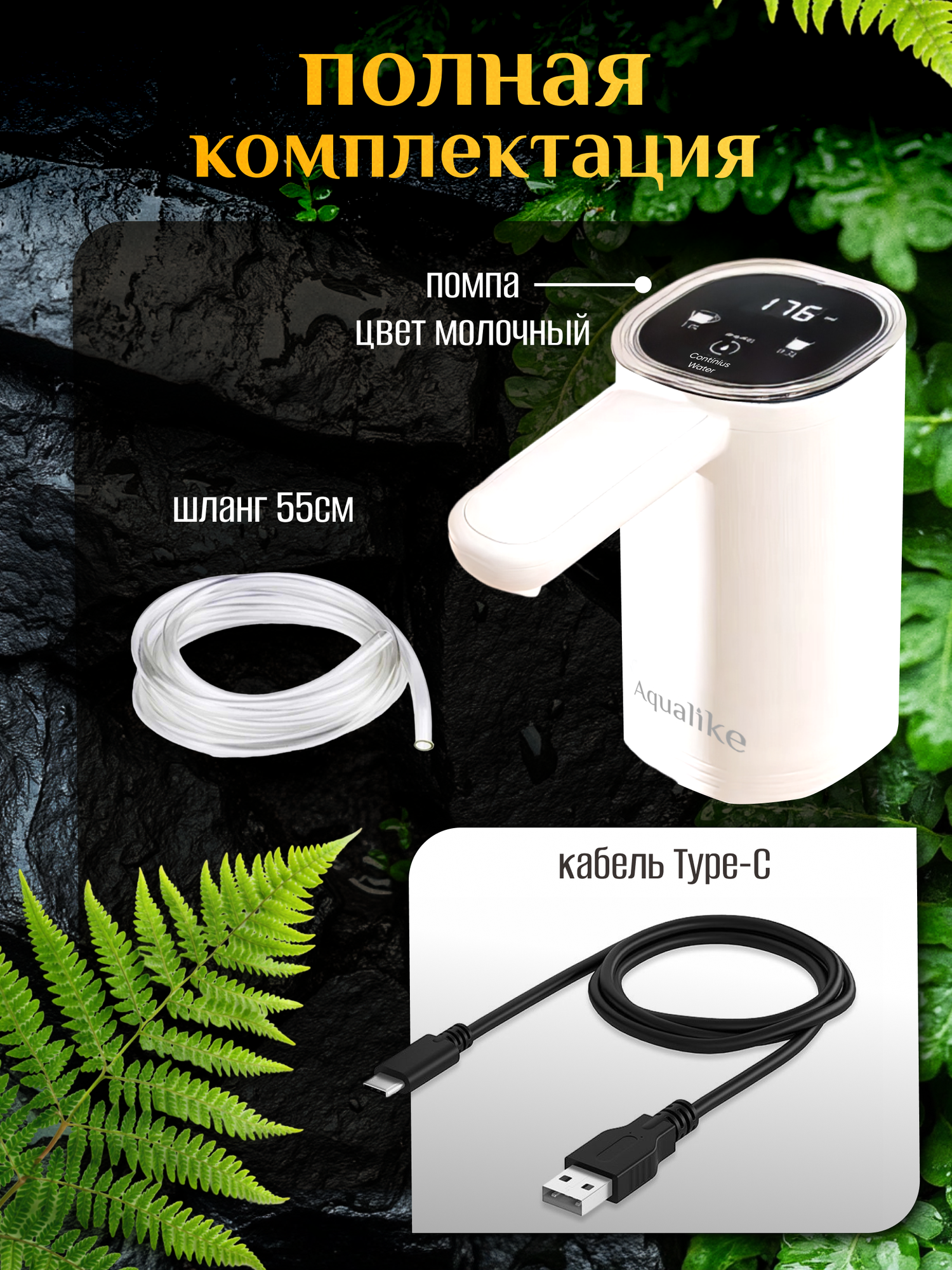 | Дополнительная информация | Электропомпа автоматическая с аккумулятором для бутилированной воды с двойным насосом и подсветкой. Комплектация: помпа для воды, кабель type-c, шланг (55 см) - 2шт., инструкция. |