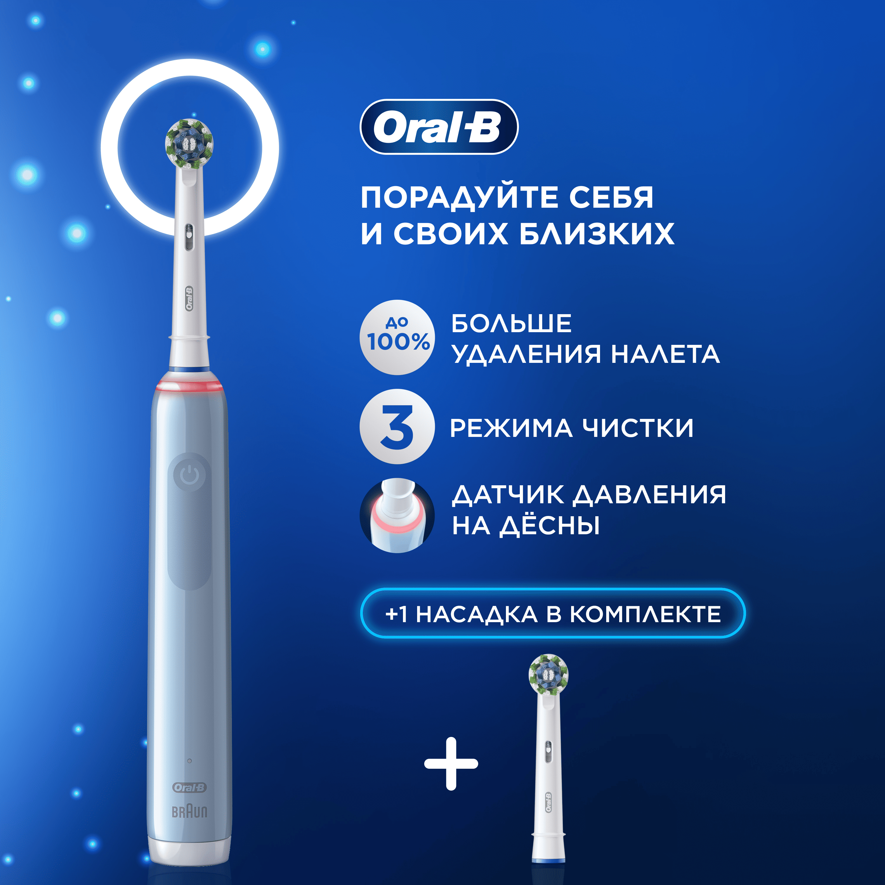 Купить Оригинальная электрическая зубная щётка Oral-B Pro 3 Голубая (1 шт) с дополнительной сменной насадкой Pro Cross Action (1 шт), подарочный набор