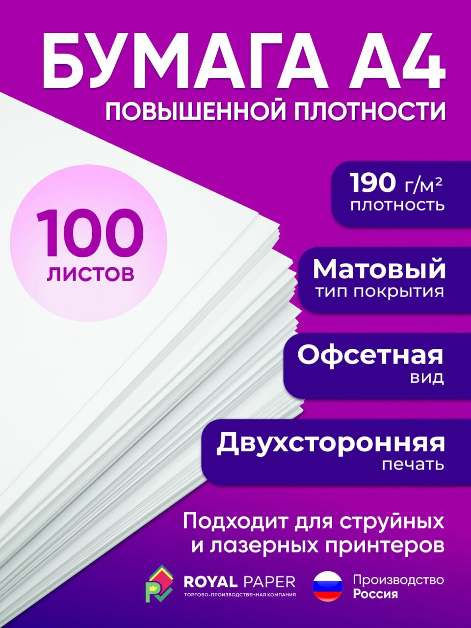 Бумага А4 плотная 190 г/м2, 100 листов, двухсторонняя, офсетная (подходит для печати на струйном и лазерном принтере)