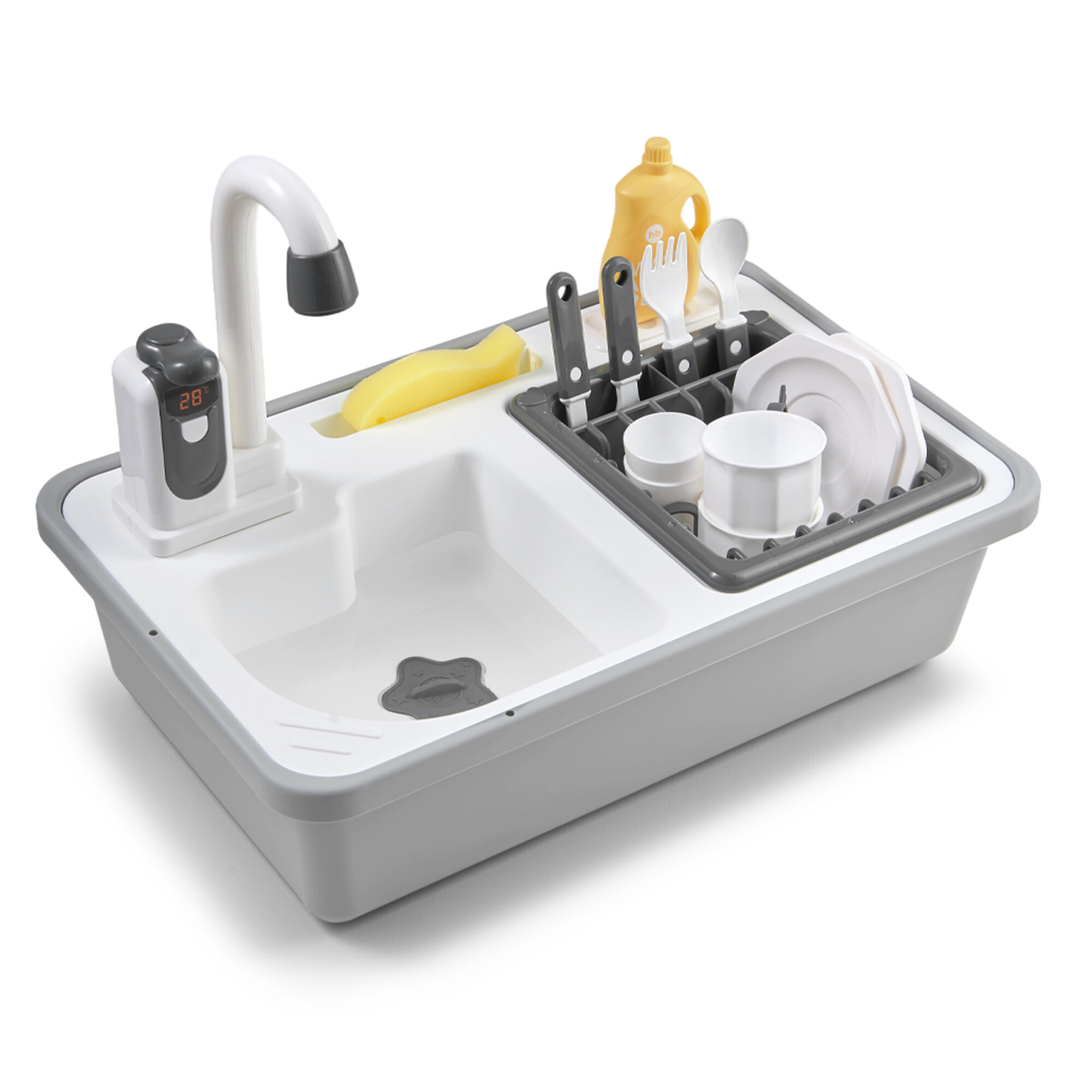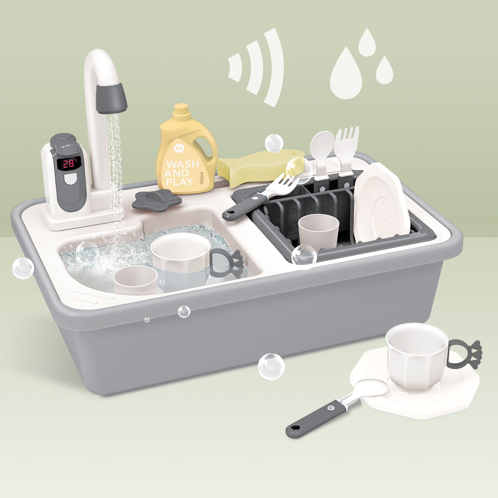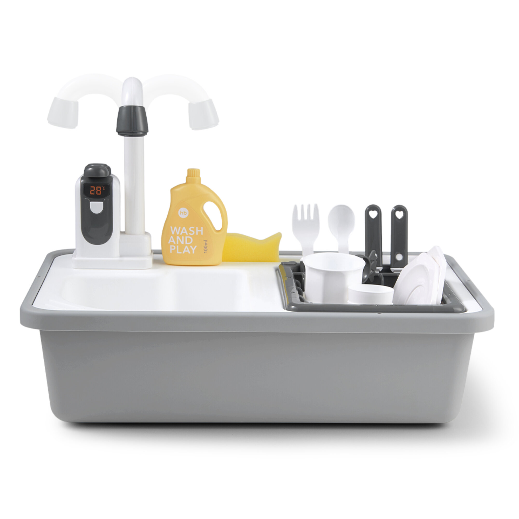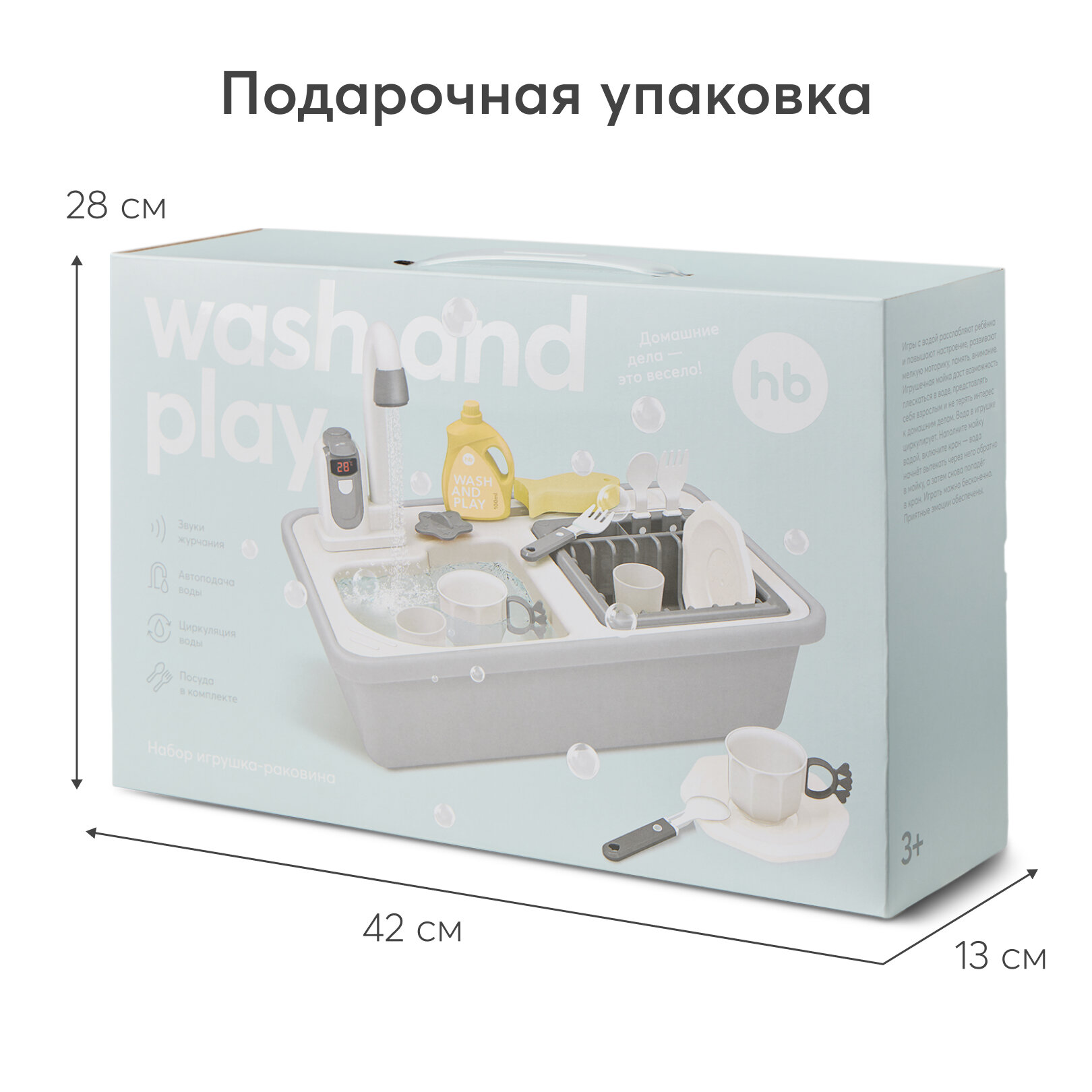 331869, Игрушечная раковина с водой WASH AND PLAY Happy Baby, игровой набор для детской кухни, 15 предметов, серый