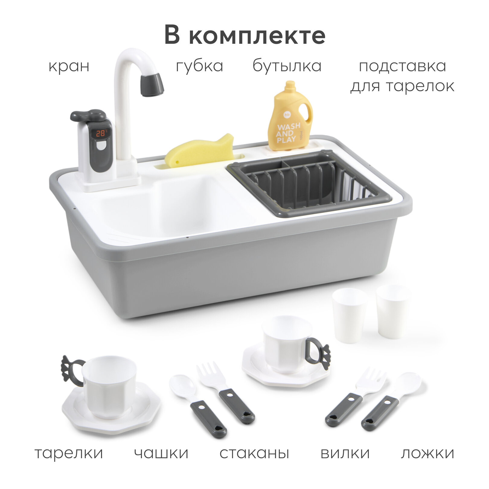 331869, Игровой набор детская кухня Happy Baby WASH AND PLAY игрушечная раковина детская с водой, 15 предметов, серый интересное: