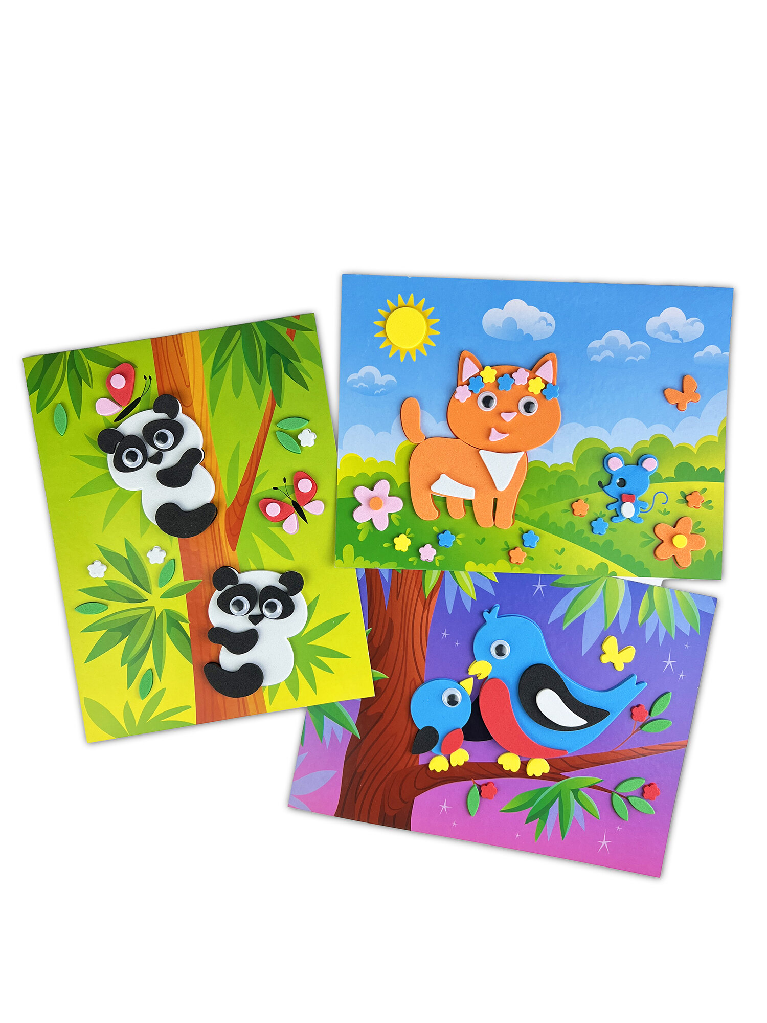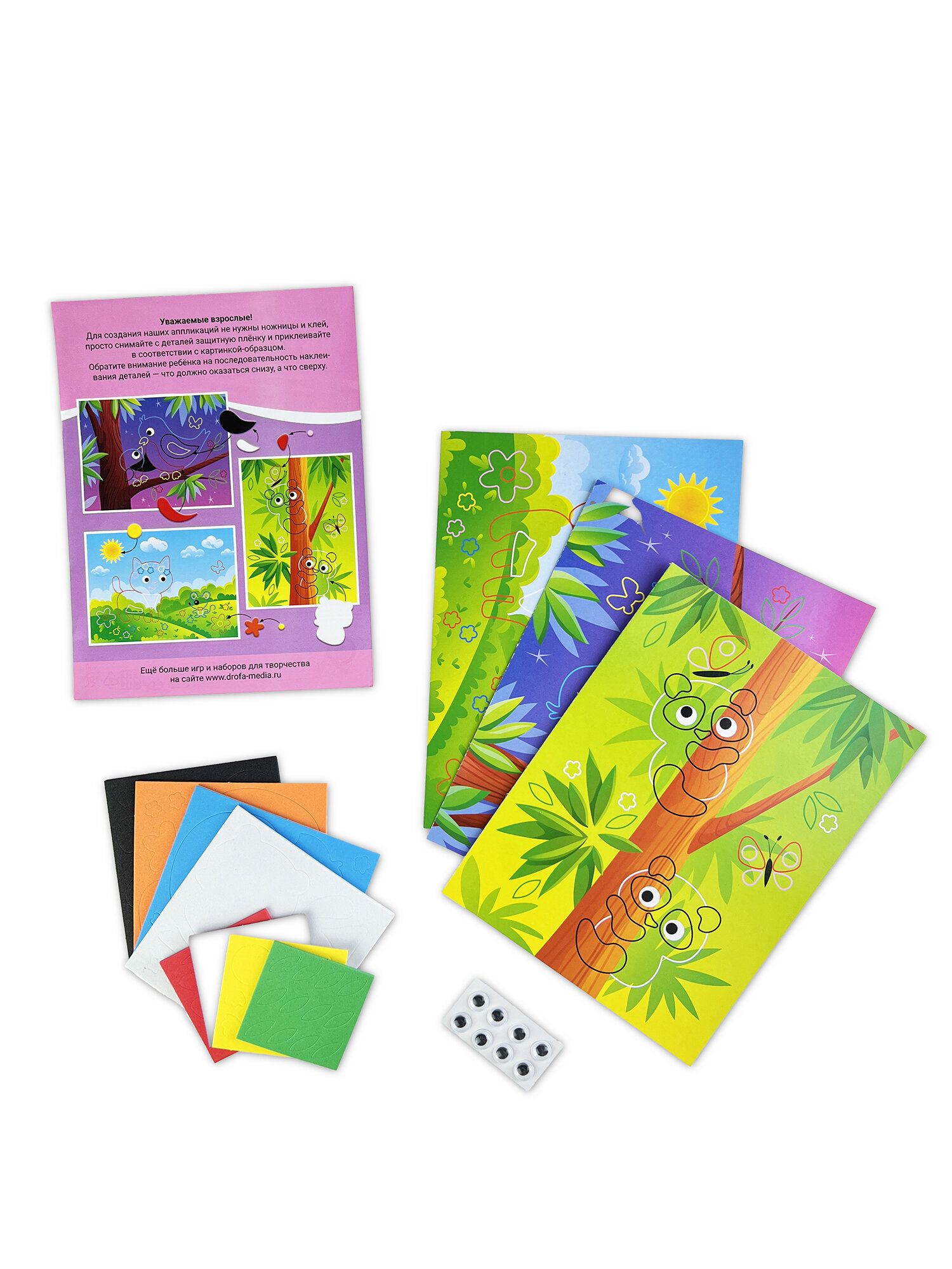 | Комплектация | В наборе: 4 цветные основы с рисунком-схемой, детали из ЭВА на самоклеящейся основе (6 цветов), декоративные элементы на самоклеящейся основе (глазки), цветная листовка-образец |