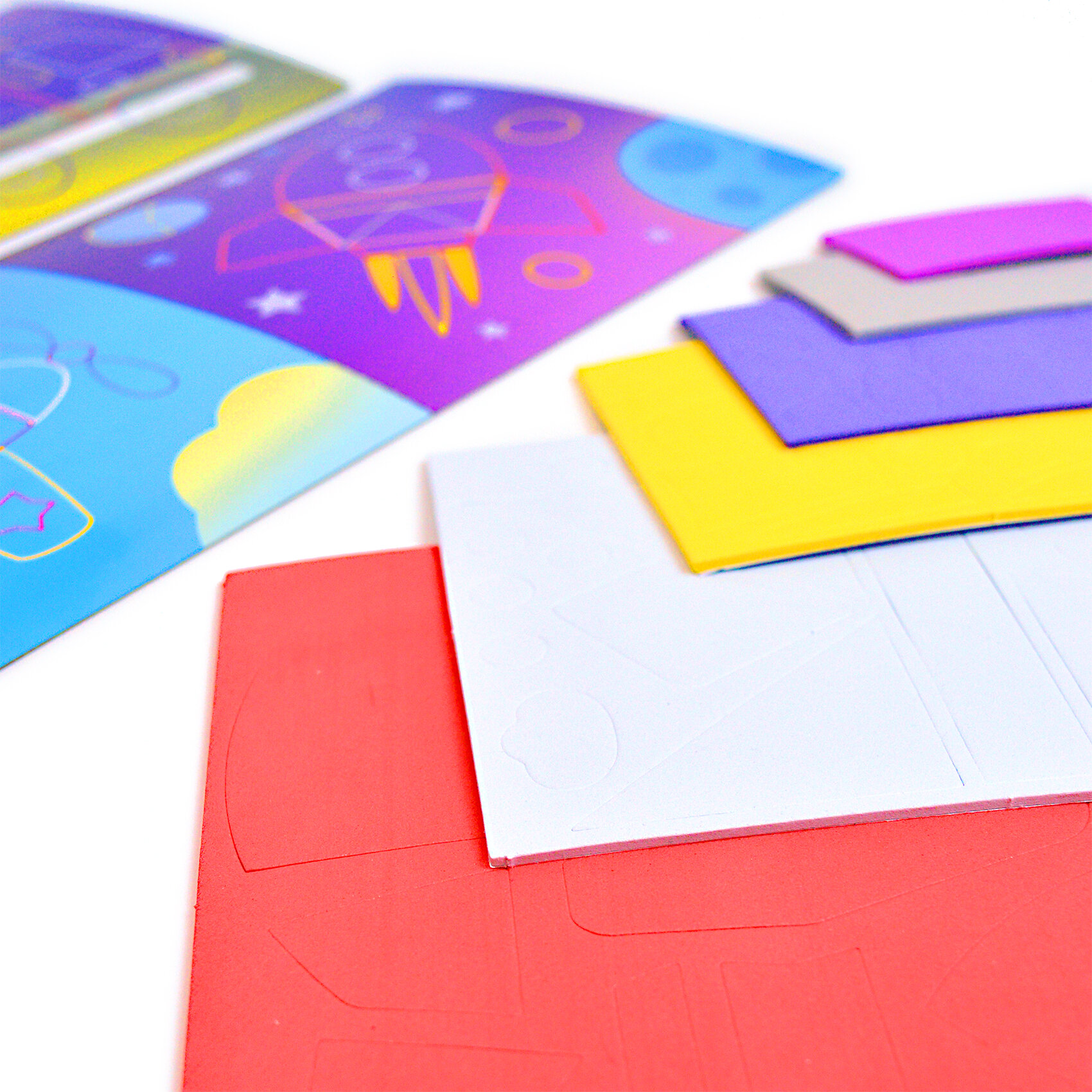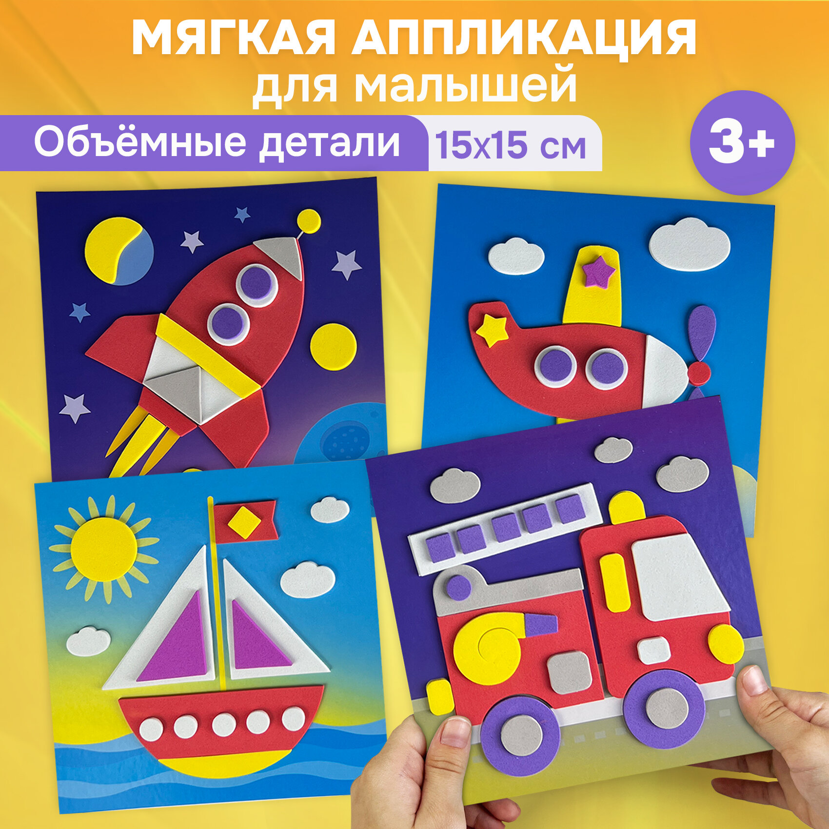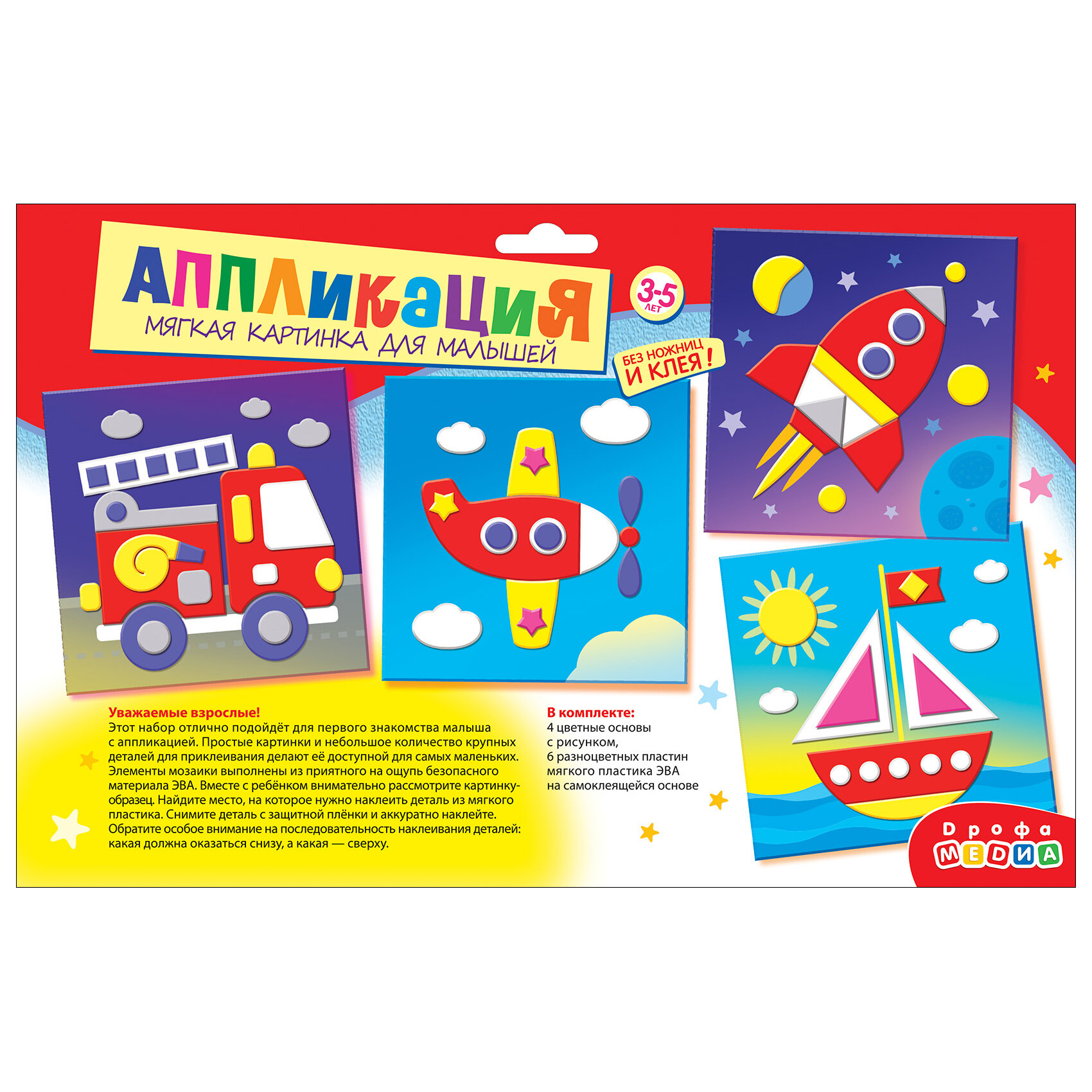 | Комплектация | В наборе: 4 цветные основы с рисунком-схемой, детали из ЭВА на самоклеящейся основе (6 цветов), декоративные элементы на самоклеящейся основе (глазки), цветная листовка-образец |