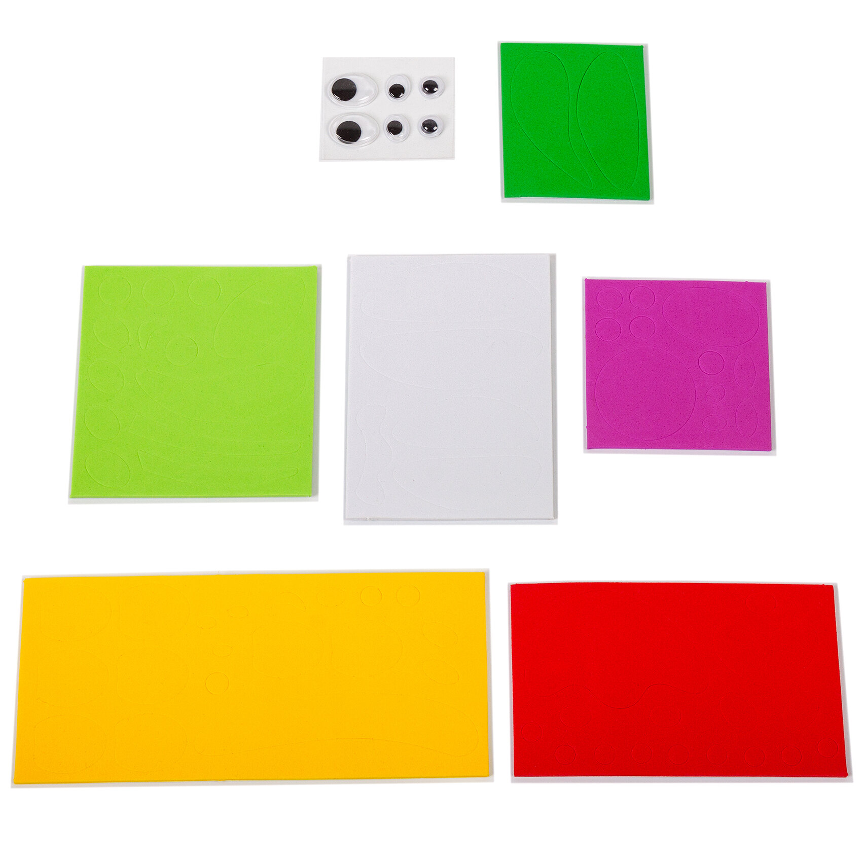 | Комплектация | В наборе: 4 цветные основы с рисунком-схемой, детали из ЭВА на самоклеящейся основе (6 цветов), декоративные элементы на самоклеящейся основе (глазки), цветная листовка-образец |