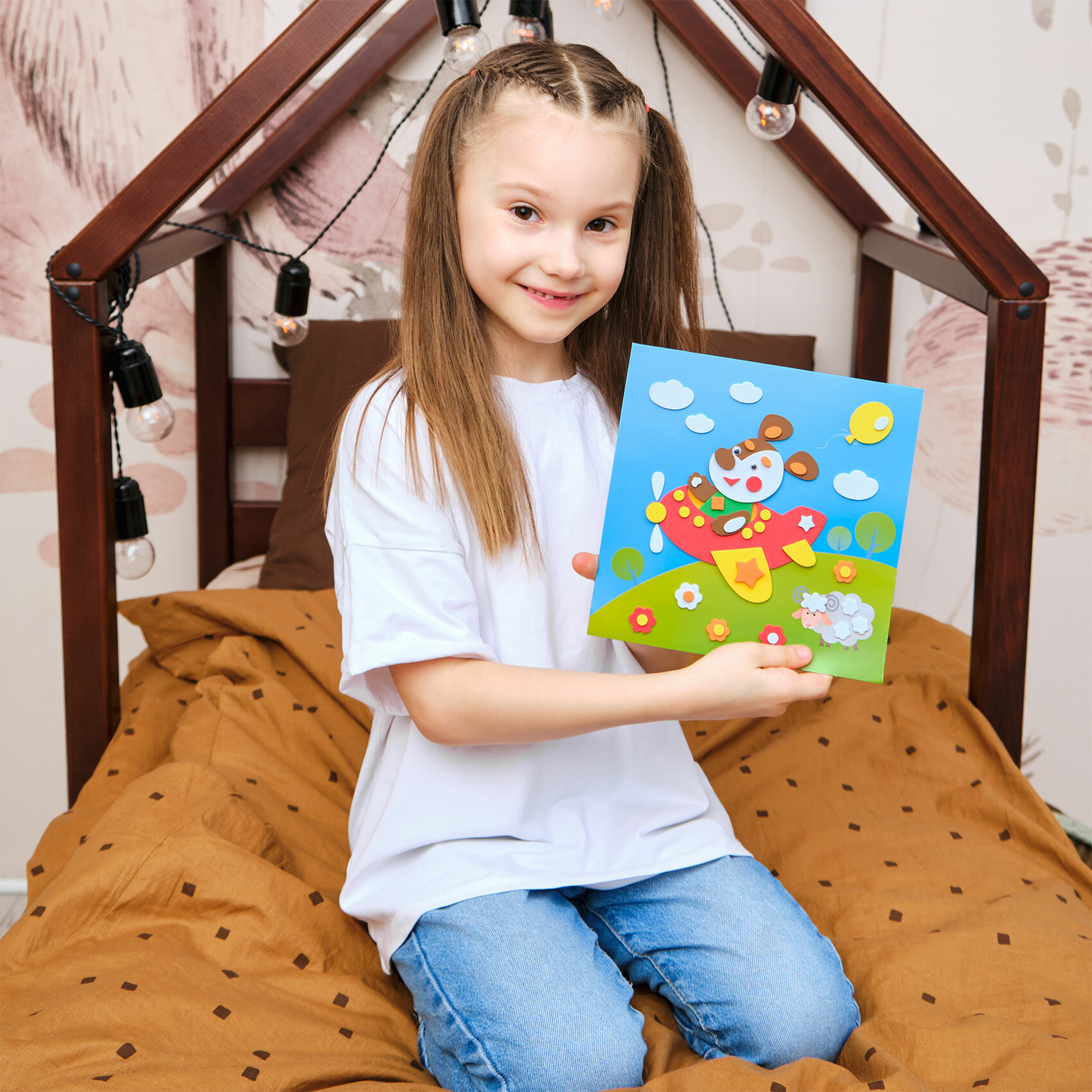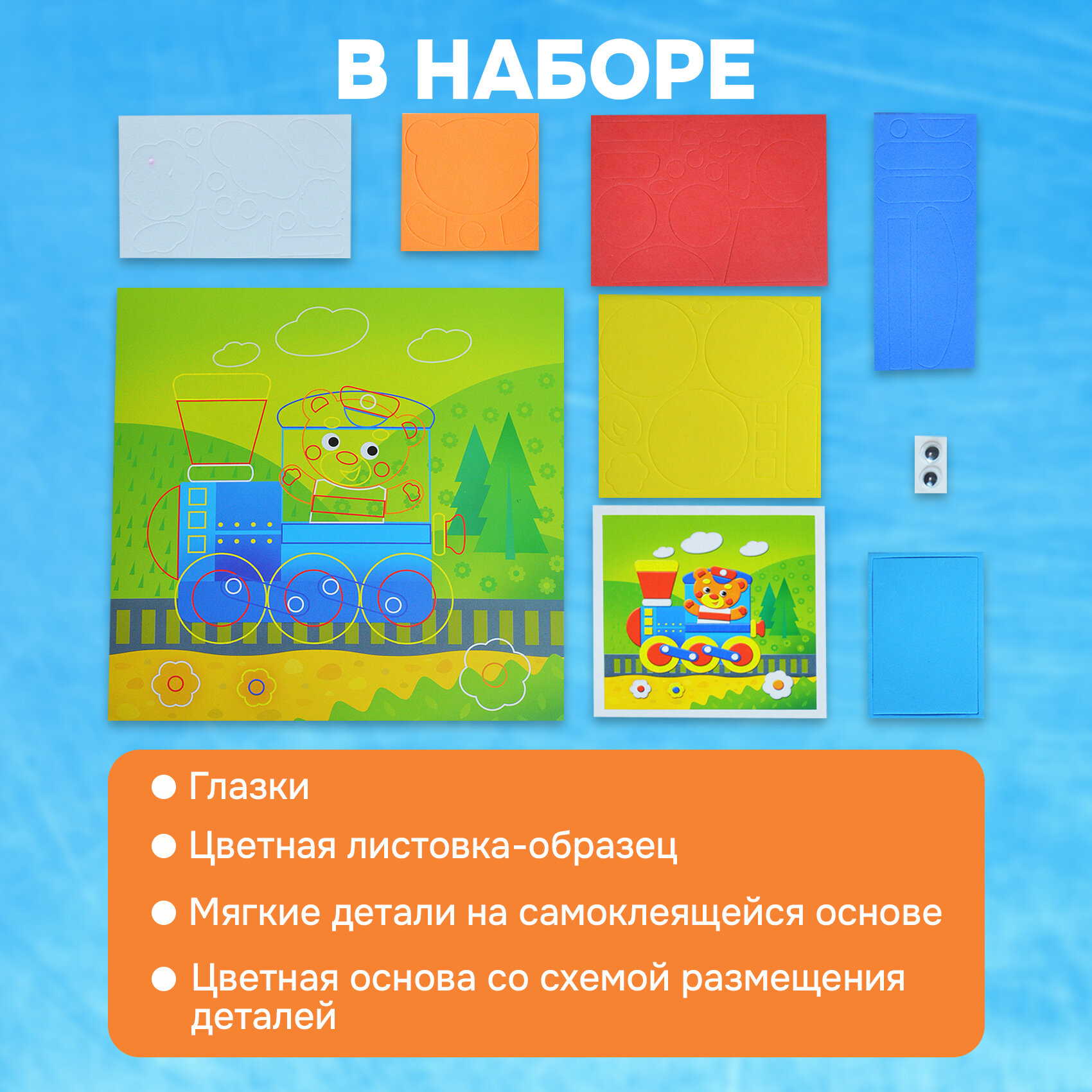 | Комплектация | В наборе: 4 цветные основы с рисунком-схемой, детали из ЭВА на самоклеящейся основе (6 цветов), декоративные элементы на самоклеящейся основе (глазки), цветная листовка-образец |