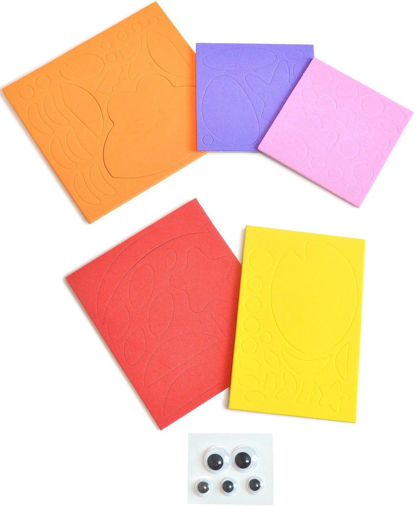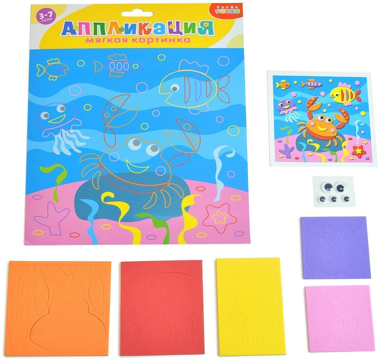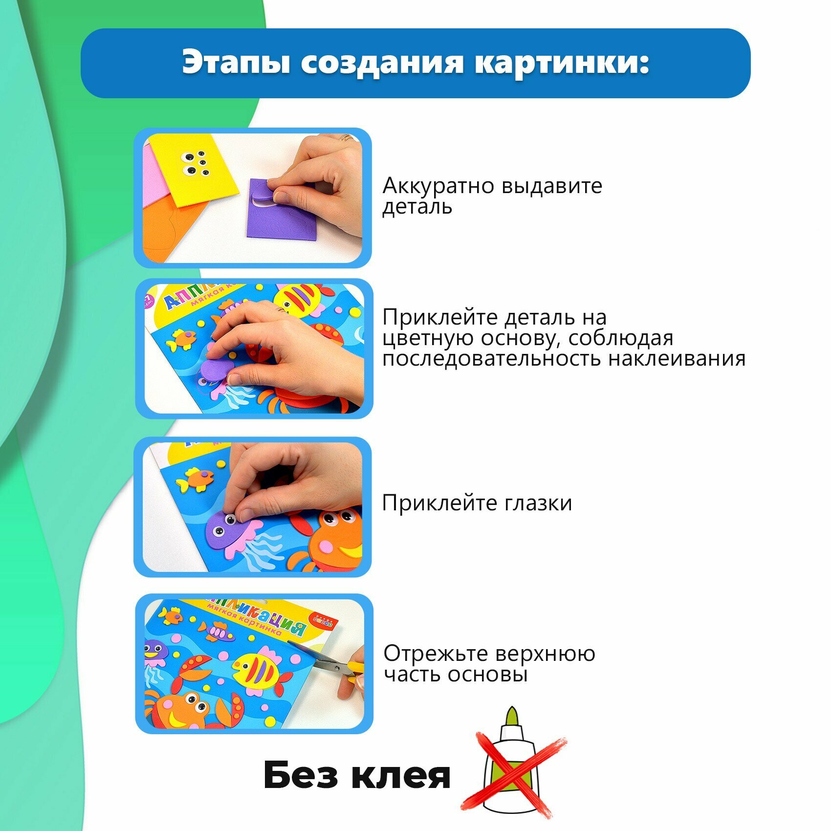 | Комплектация | В наборе: 4 цветные основы с рисунком-схемой, детали из ЭВА на самоклеящейся основе (6 цветов), декоративные элементы на самоклеящейся основе (глазки), цветная листовка-образец |