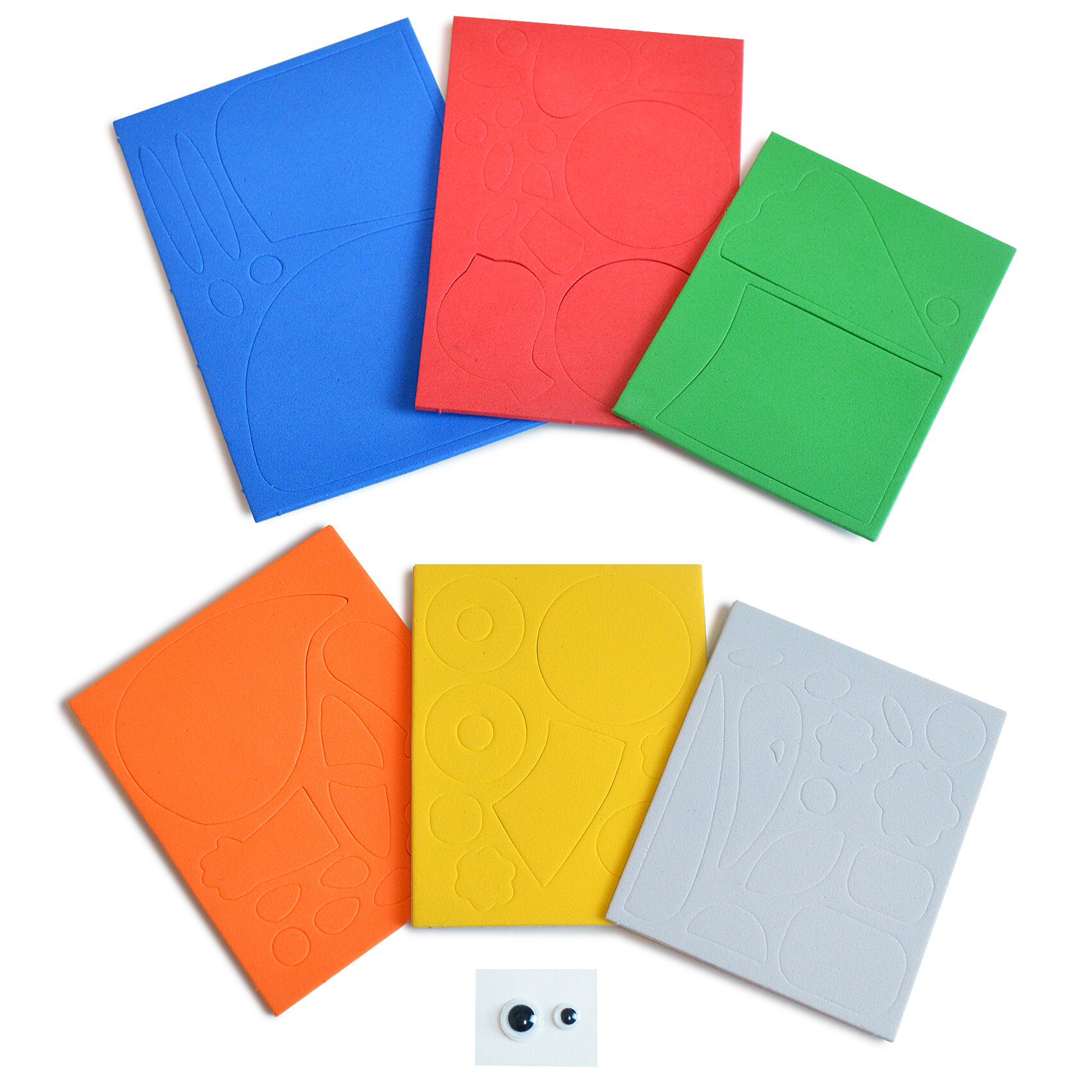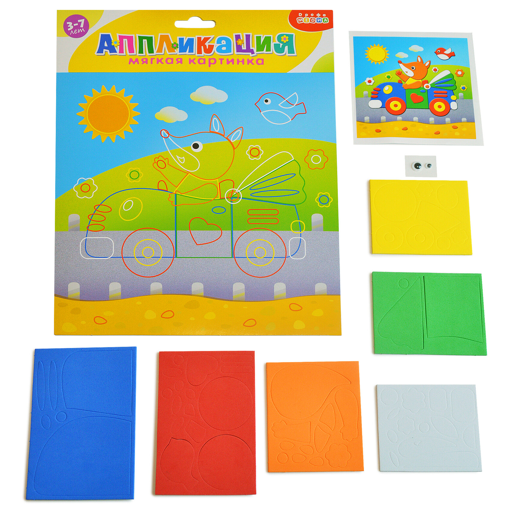| Комплектация | В наборе: 4 цветные основы с рисунком-схемой, детали из ЭВА на самоклеящейся основе (6 цветов), декоративные элементы на самоклеящейся основе (глазки), цветная листовка-образец |