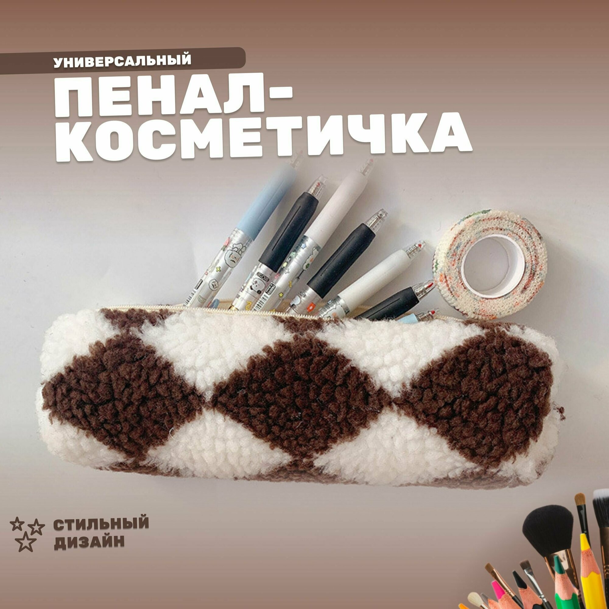 Купить Пенал - косметичка плюшевый на молнии мягкий тканевый, рисунок коричневый ромб