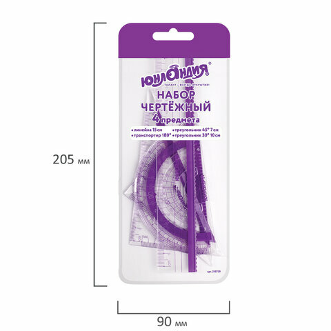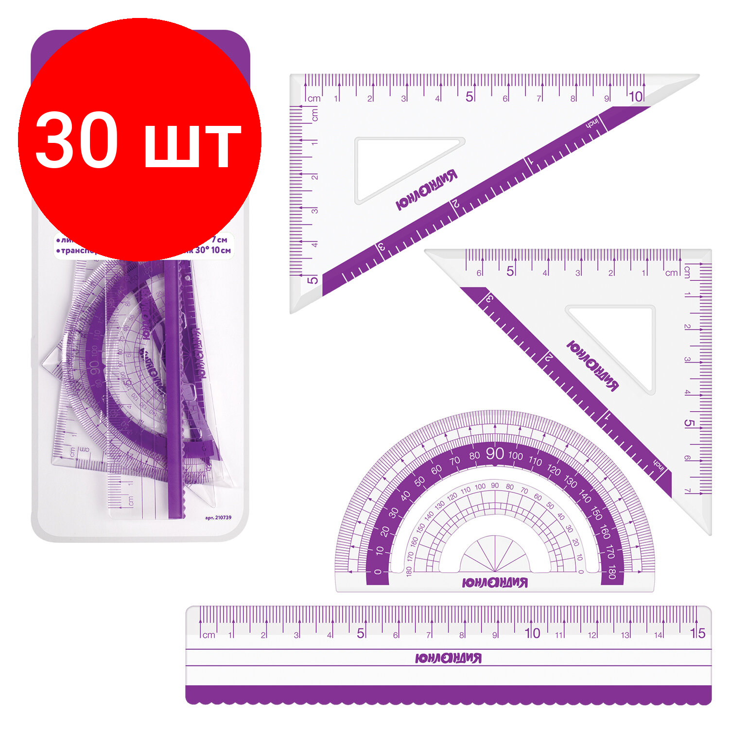 Купить Комплект 30 шт, Набор чертежный малый юнландия "геометрия" (линейка 15 см, 2 треугольника, транспортир), фиолетовая шкала, 210739