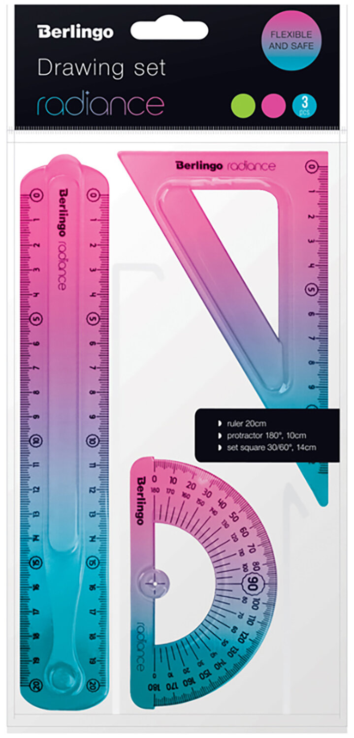Комплект 16 шт, Набор чертежный средний Berlingo "Radiance" (треуг. 14см, линейка 20см, транспортир) гибкий, розовый/голубой градиент