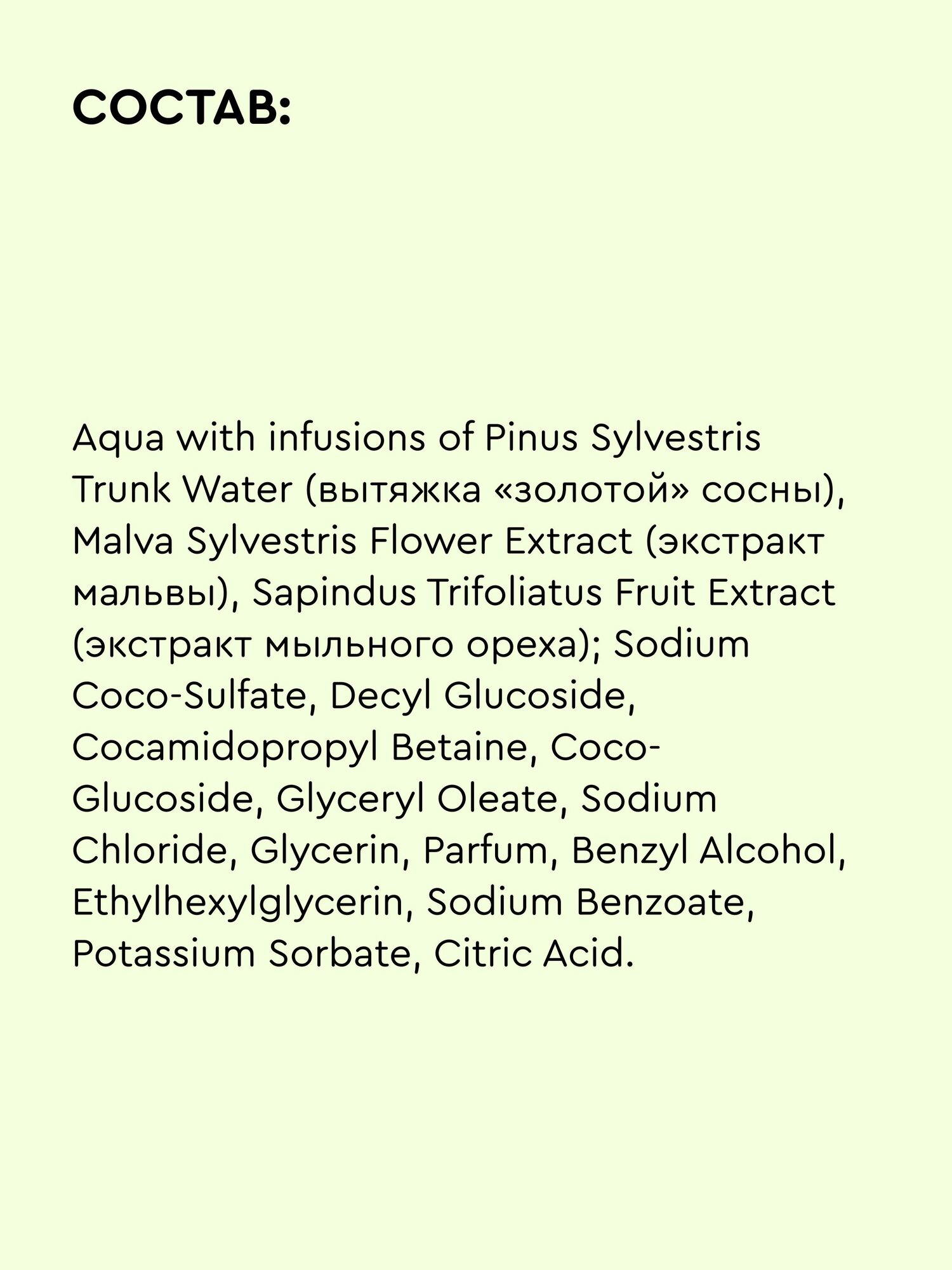 | Состав | Aqua with infusions of Pinus Sylvestris Trunk Water (вытяжка «золотой» сосны), Nuphar Luteum Root Extract (экстракт водяной лилии); Sodium Coco-Sulfate, PEG-7 Glyceryl Cocoate, Decyl Glucoside, Cocamidopropyl Betaine, Sodium Chloride, Cocos Nucifera Oil (масло кокоса), Glycerin, Parfum, Benzyl Alcohol, Ethylhexylglycerin, Sodium Benzoate, Potassium Sorbate, Citric Acid. |