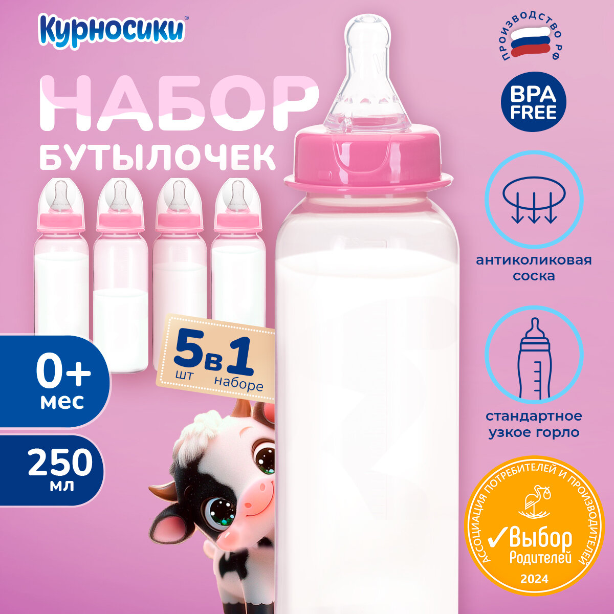 Купить Бутылочка для кормления новорожденных антиколиковая Курносики набор из 5 штук 250 мл, розовые 0+