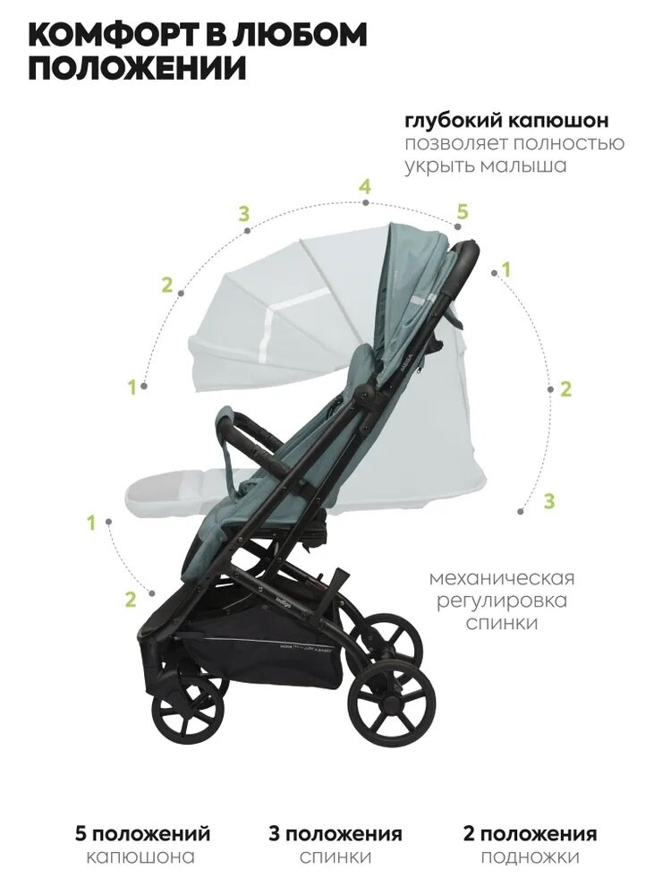 | Комплектация | коляска; москитная сетка; подстаканник; сумка-чехол для перевозки; накидка на ножки |