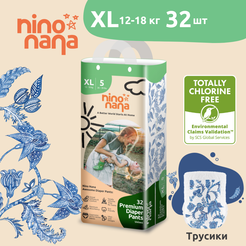 Подгузники-трусики детские Nino Nana XL (12-18 кг), 5 размер. 32 штуки, расцветка Бали (Q-форма) интересное: