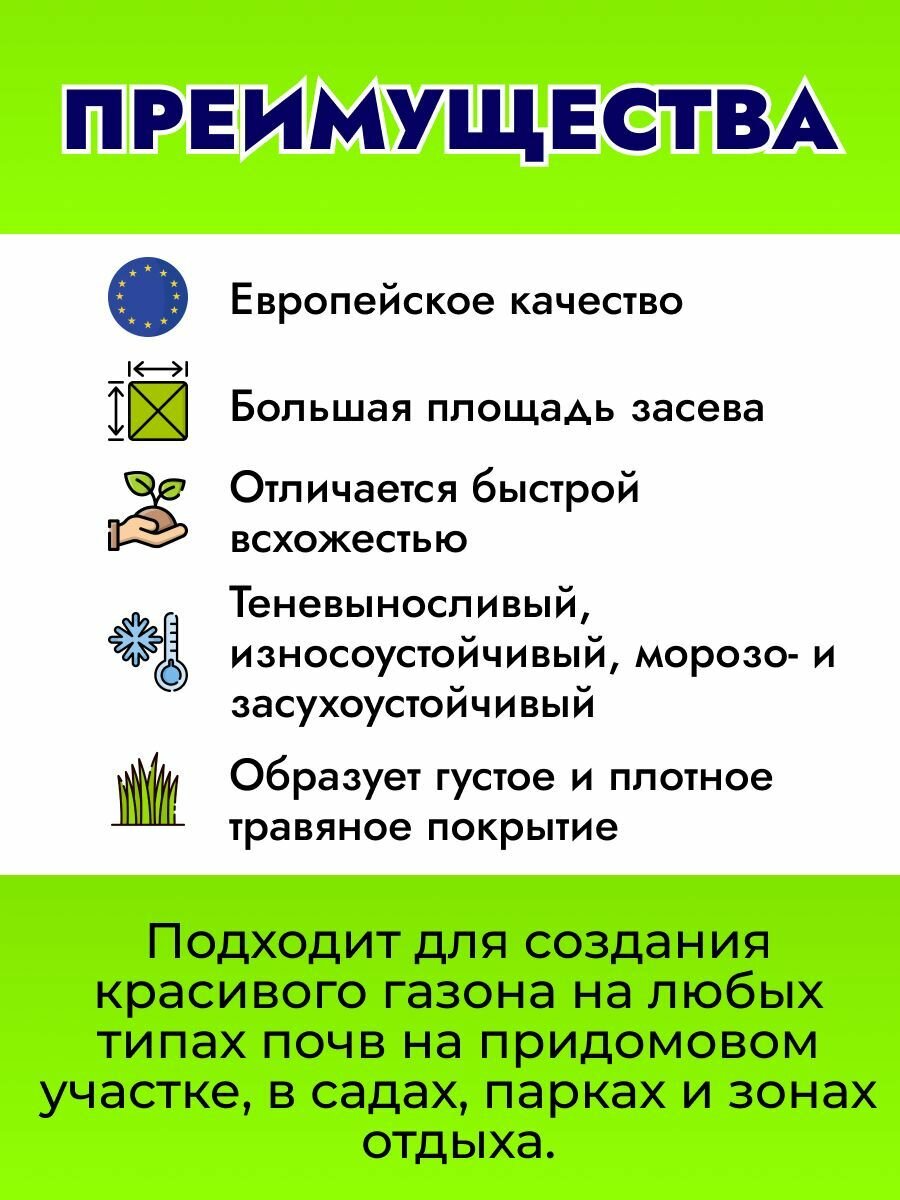 | Состав смеси | райграс многолетний - 40%, овсяница красная красная (сорт 1) - 15%, овсяница красная красная (сорт 2) - 15%, овсяница тростниковая 10%, райграс итальянский - 10%, мятлик луговой - 10% |