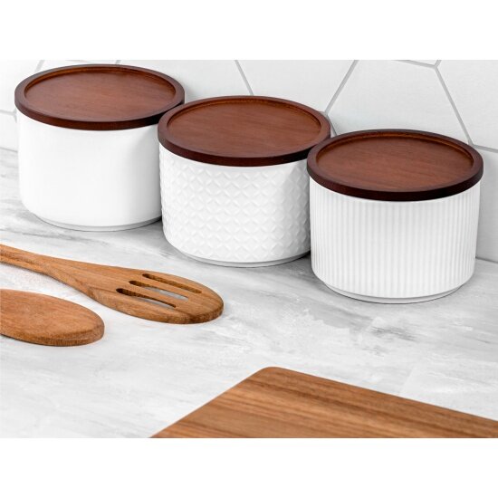 | Дополнительная информация | Набор 3 банок для хранения "Колоранс - микс" белый, 9,3х9,3х7 см, 250 мл - каждая, с деревянной крышкой-подставкой с силиконовым уплотнителем, высота без крышки - 6 см |