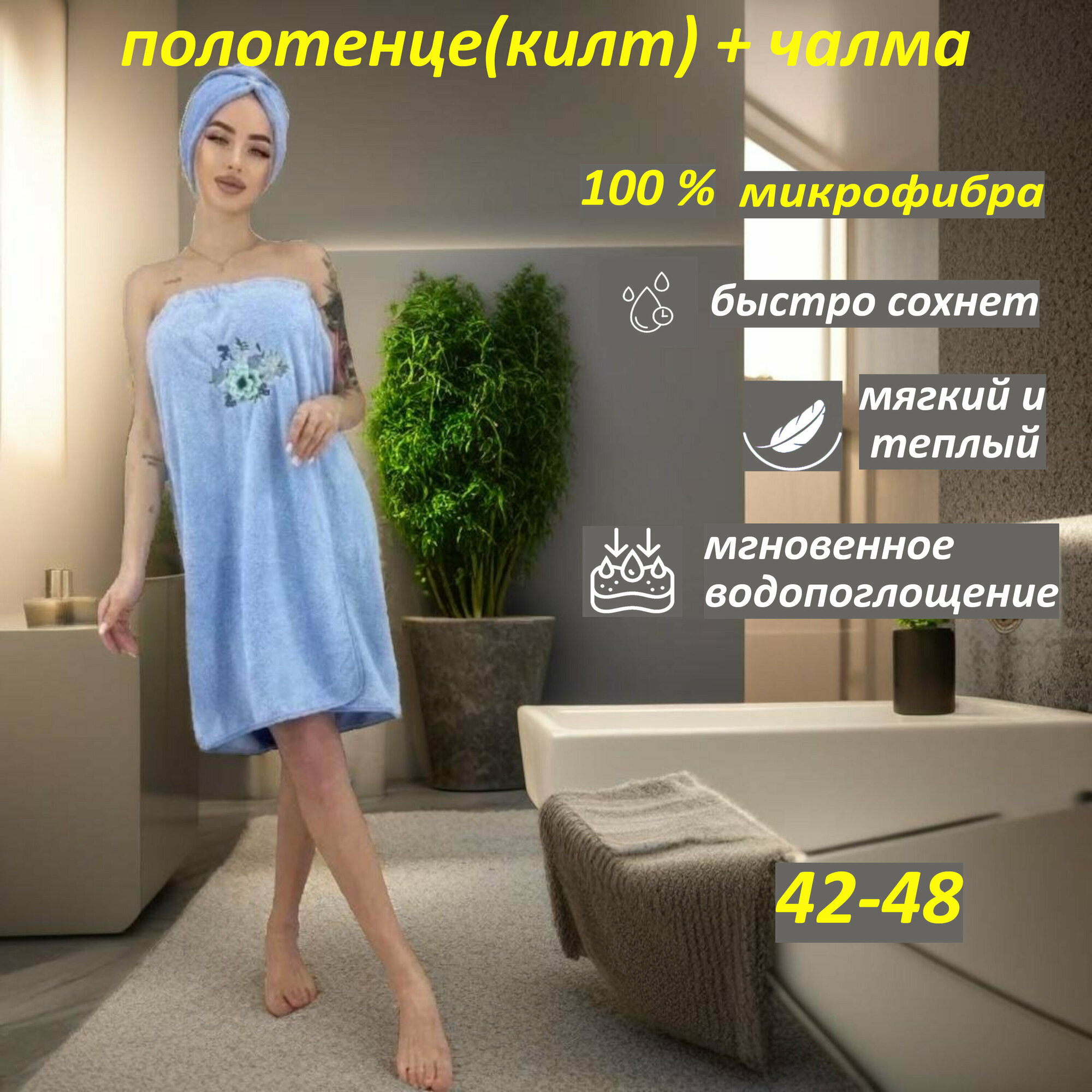 СохранитьКилт-полотенце New Leaf Home, с чалмой, для сауны, женское, голубое, из микрофибры интересное:
