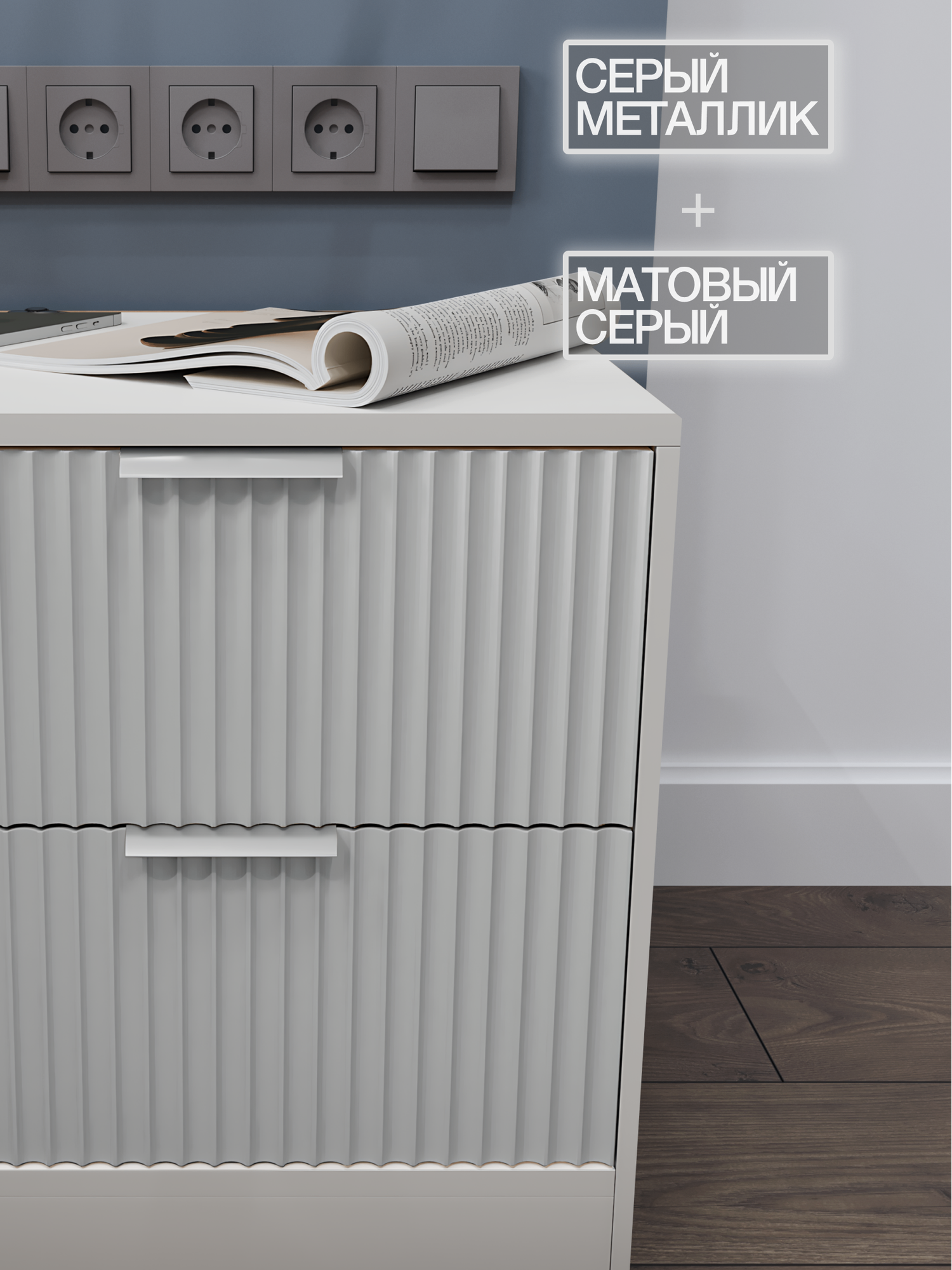 Прикроватная тумба KOMODO ВОЛНА-2, с фрезеровкой, белая/серая , напольная, 43.6х40х45.7