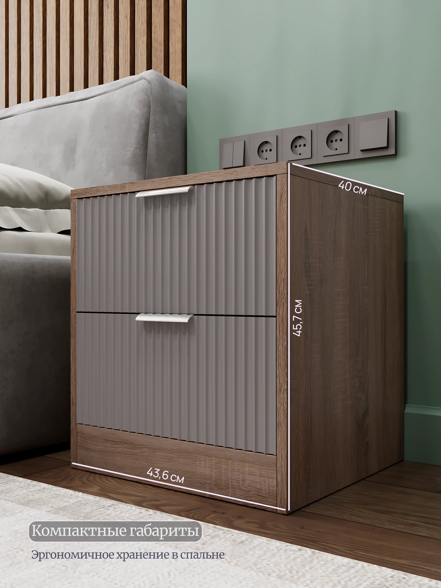 Тумба прикроватная без ручек KOMODO Дуб Крафт Белый/Железный камень (серый), 2 ящика, 47х40х48