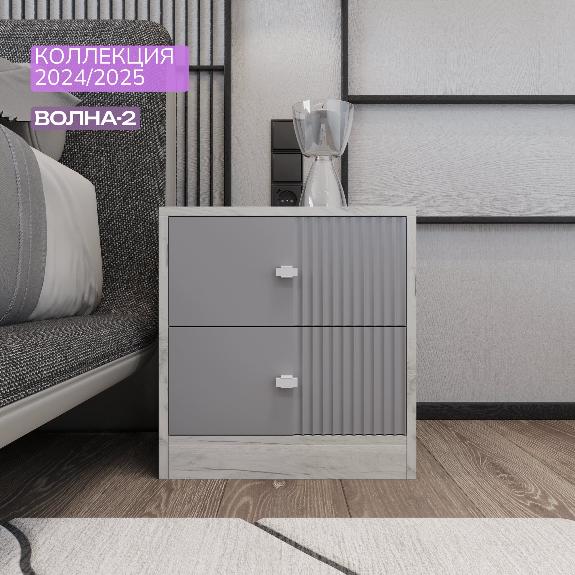 Прикроватная тумба KOMODO ВОЛНА-2, с фрезеровкой, белая/серая 43.6х40х45.7