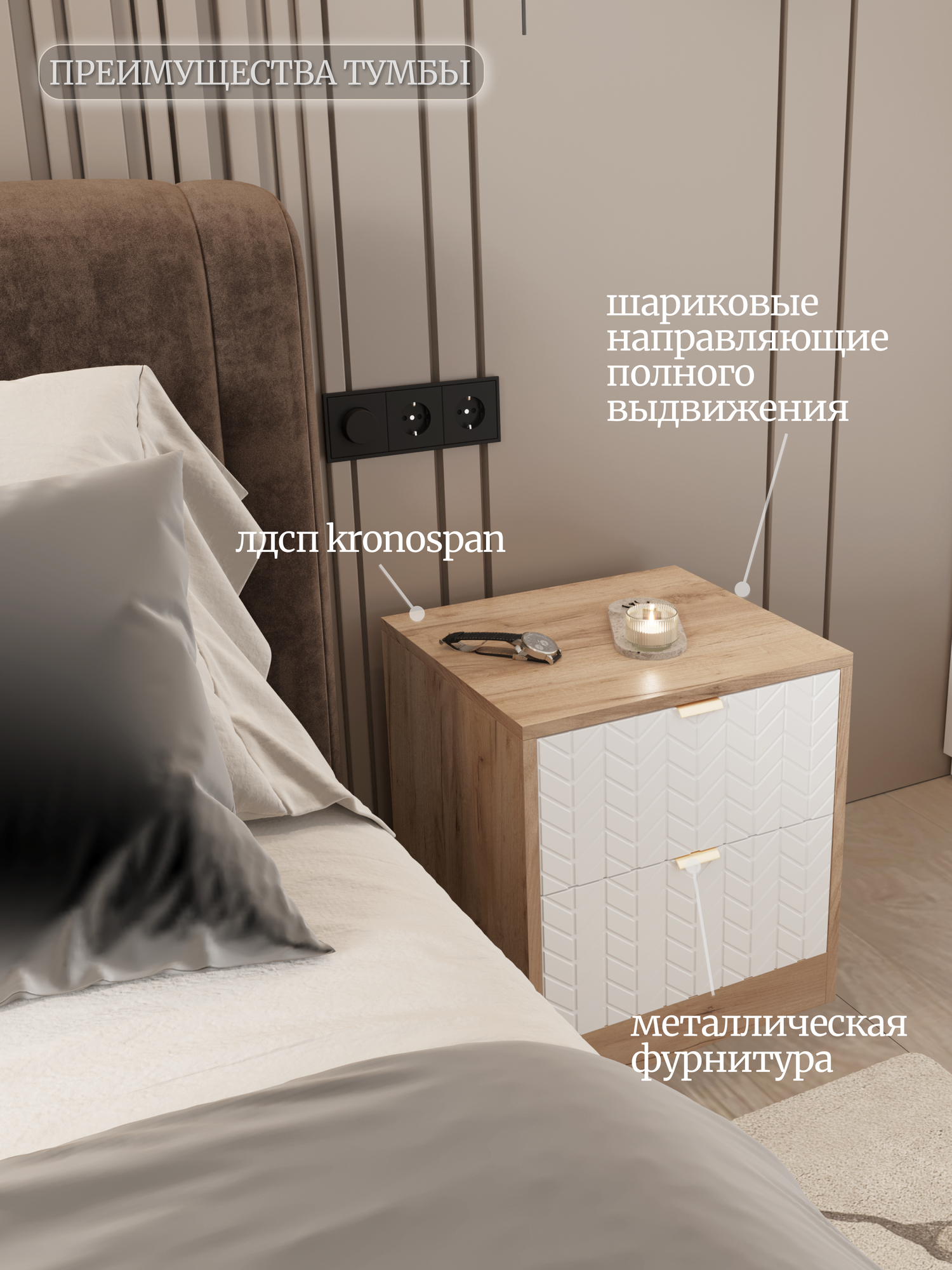 Тумба прикроватная без ручек KOMODO Дуб Крафт Белый/Железный камень, 2 ящика, 47х40х48