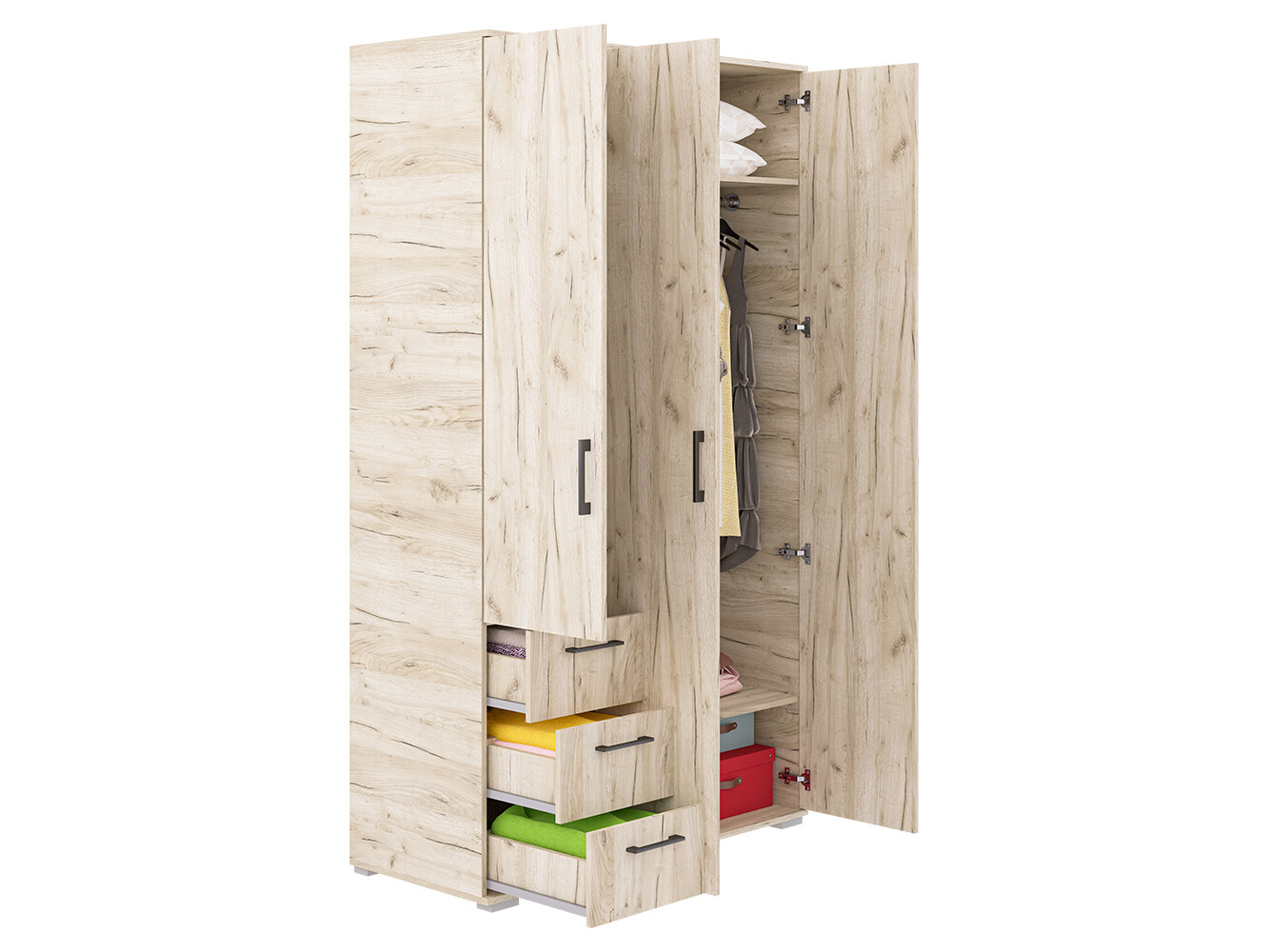 | Комплектация | распашные дверцы, штанга, 6 вместительных полок, три выдвижных ящика |