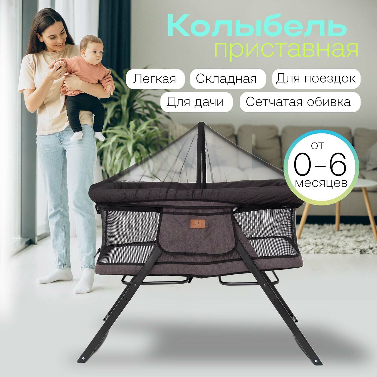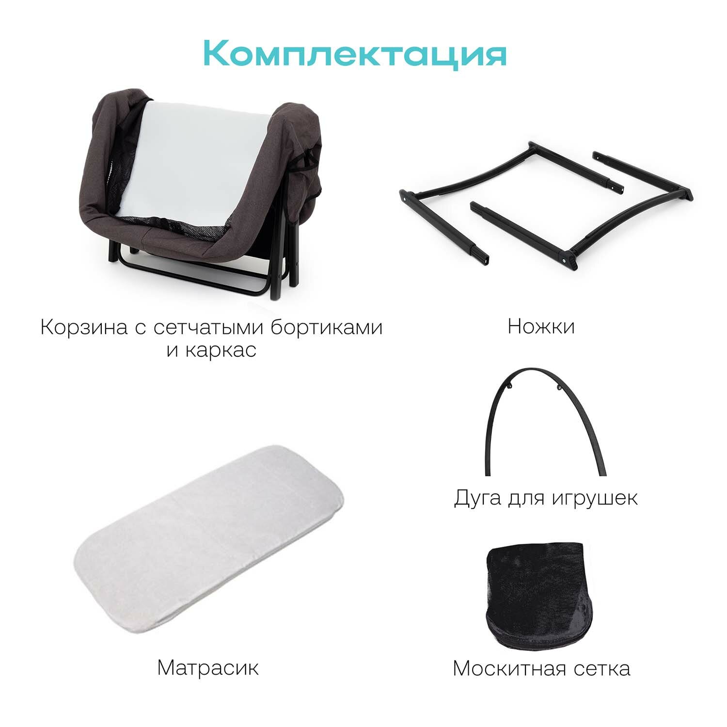 | Комплектация | Каркас колыбели / Корзина с сетчатыми бортиками / матрасик / Москитная сетка с дугой |