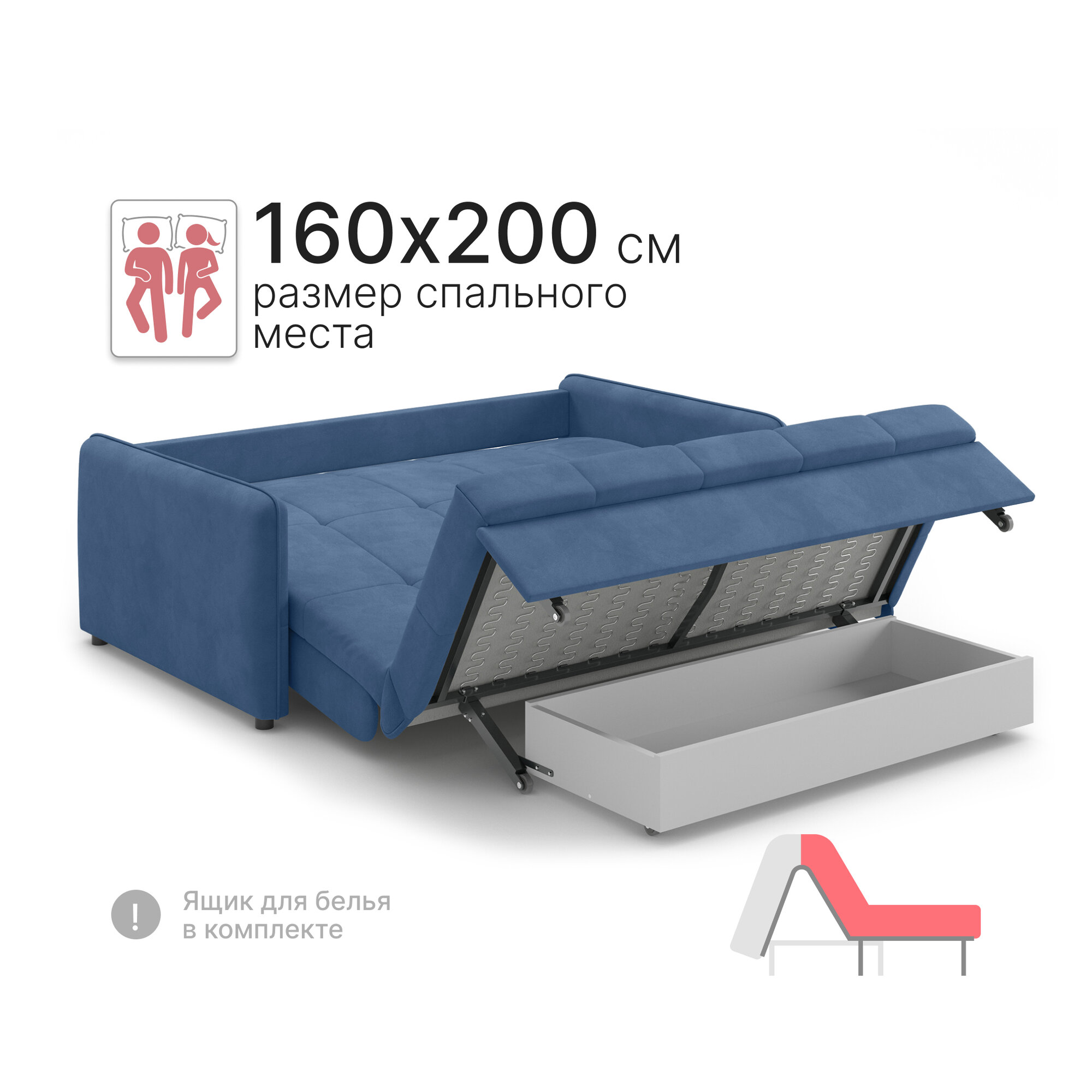 Купить Диван-кровать раскладной с ящиком прямой на металлокаркасе, аккордеон, ортопедический, 160х200 Хилтон NEW, велюр синий