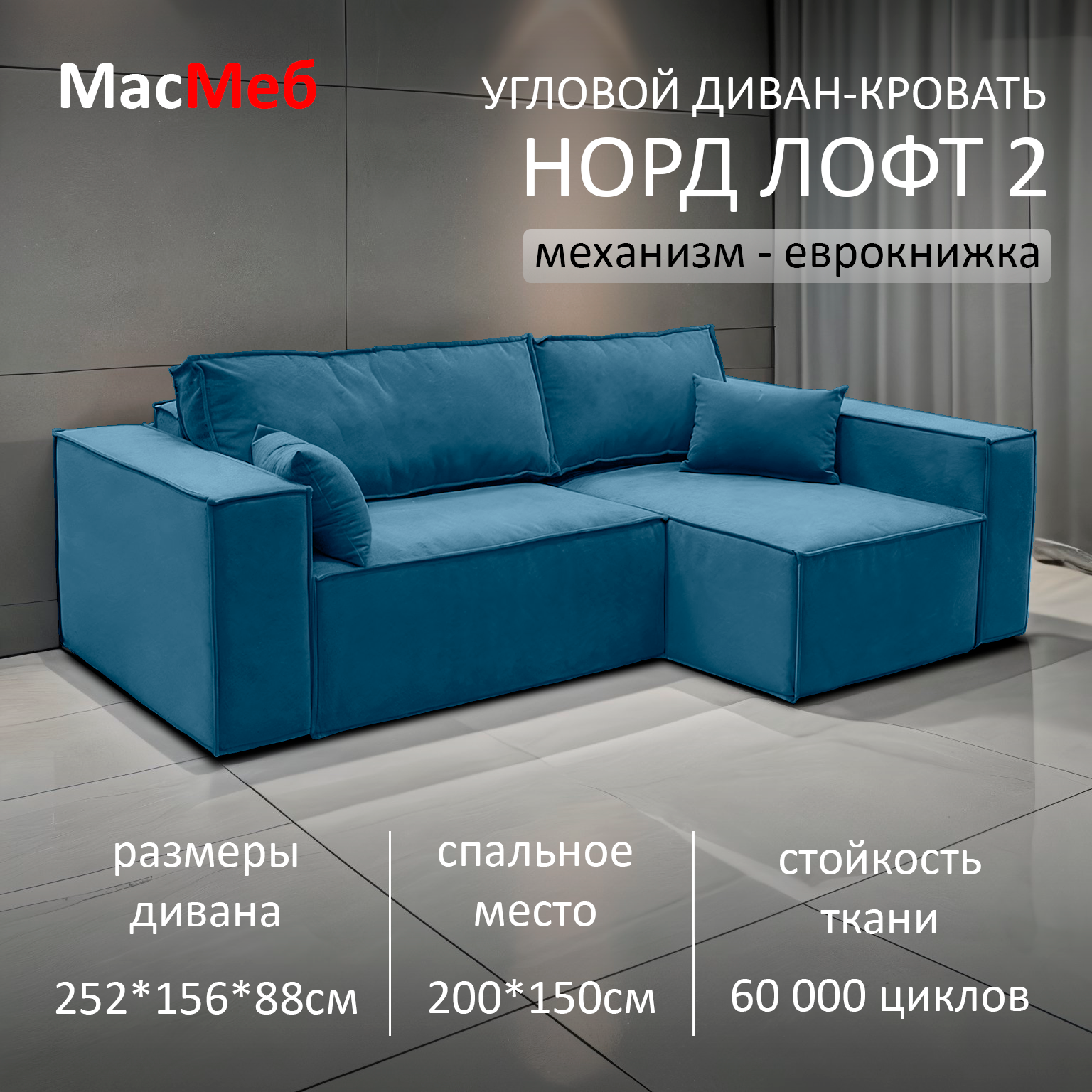 Купить Диван угловой МасМеб Норд-Лофт-2, цвет синий, Правый угол, еврокнижка