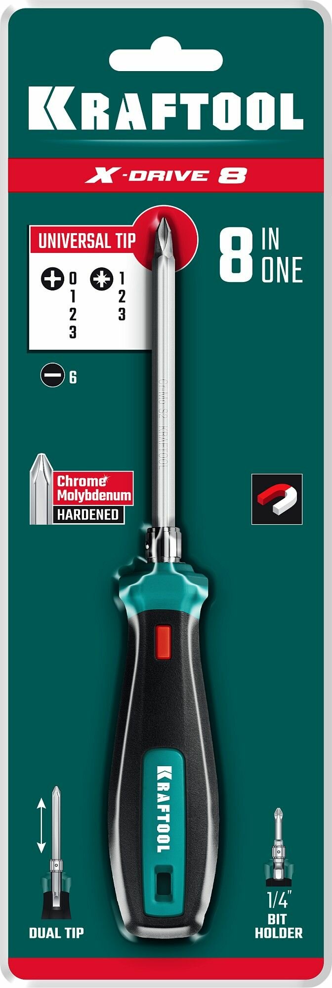 Универсальная отвертка Kraftool с двусторонним стержнем PH0-1-2-3 PZ1-2-3 SL 6 мм 8 в 1 26168
