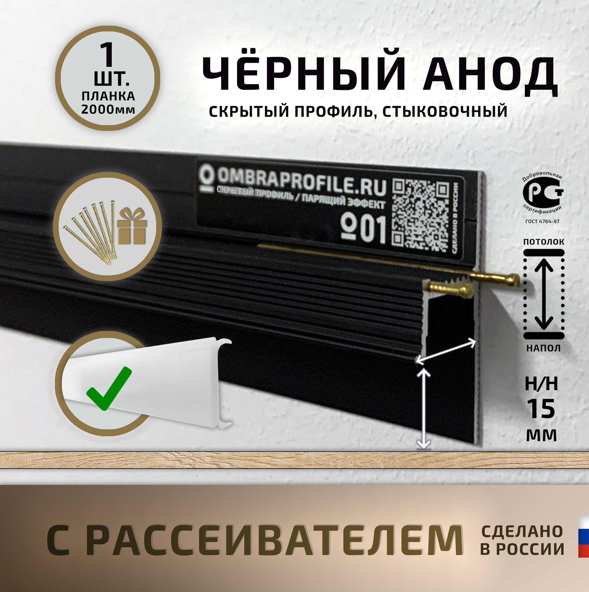 Купить Теневой профиль 15 мм Ombra Profile, для потолков/стен, черный анод, с белым рассеивателем (1 шт.)