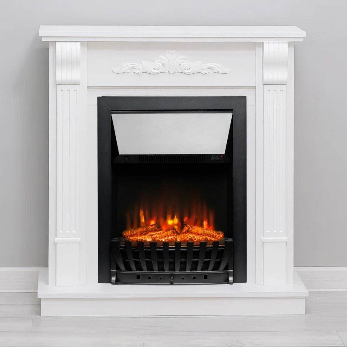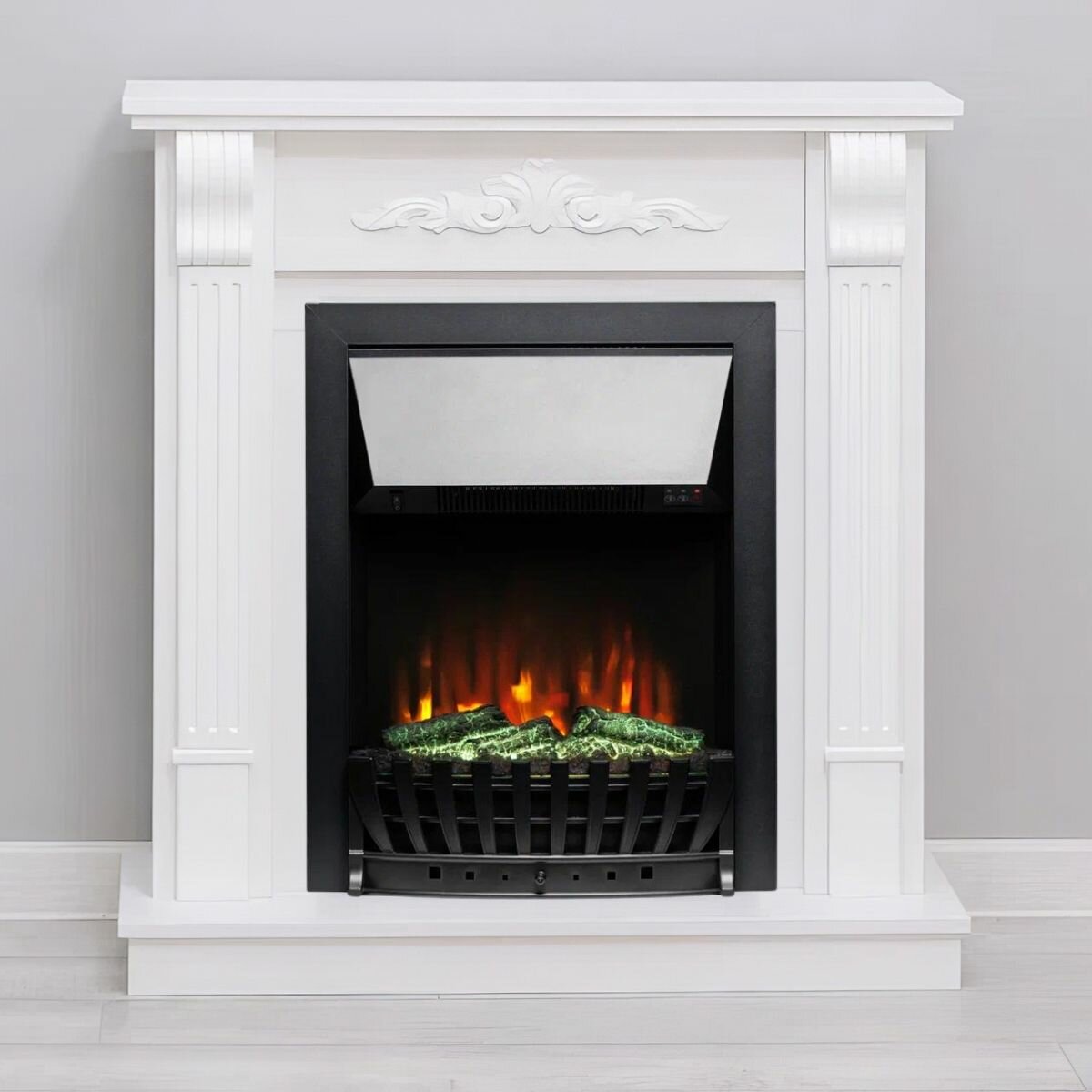 Камин электрический ELEKAM SILVER белый с очагом с пультом, обогревом и звуком потрескивания дров (Электрокамин)