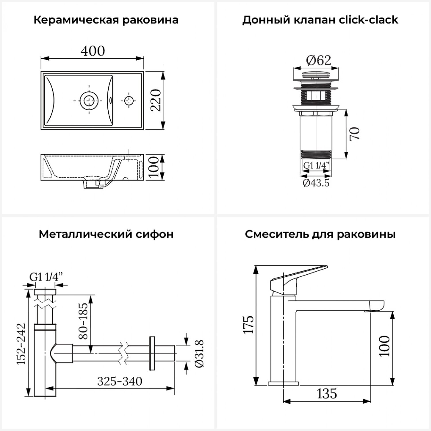 Маленькая раковина в ванную комнату или туалет Wellsee WC Area 202010495 в наборе 4 в 1: узкая раковина 40 см, донный клапан, сифон, смеситель (цвет набора хром)