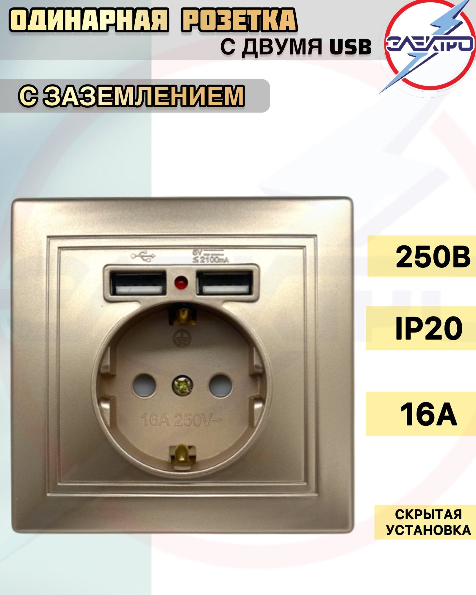 Купить Розетка с заземлением Мира +2 USB жемчужное золото