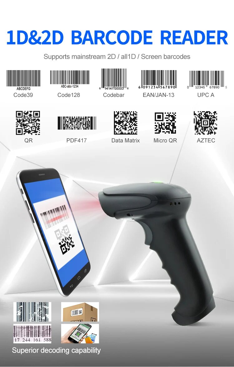 Портативный беспроводной Bluetooth 2D сканер штрих-кодов, GT-9701 2D Wired