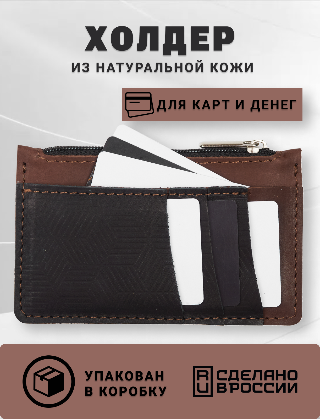 Кожаный картхолдер визитница для карт и монет с молнией, коричневый с черным