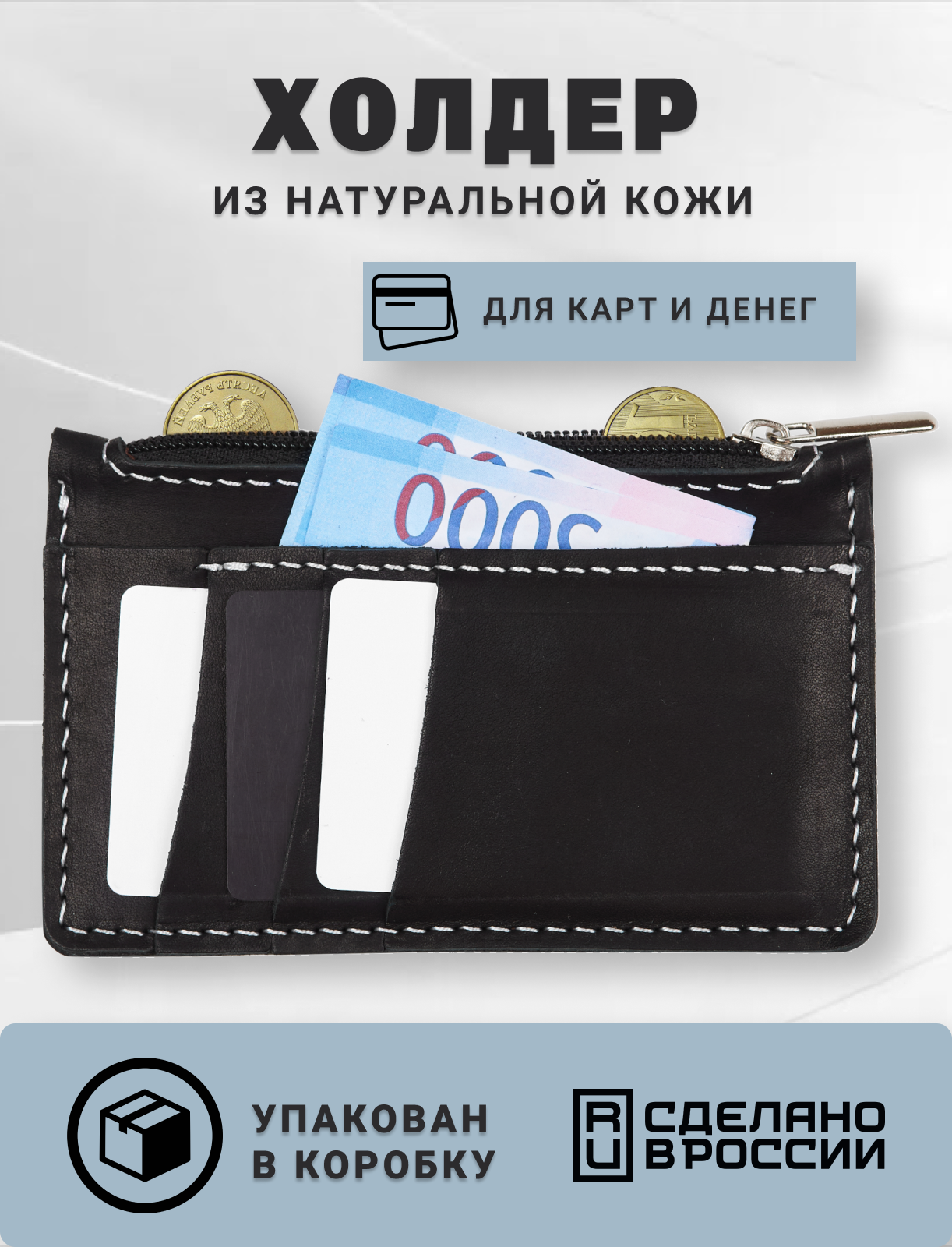 Кожаный картхолдер визитница для карт и монет с молнией, черный с белым