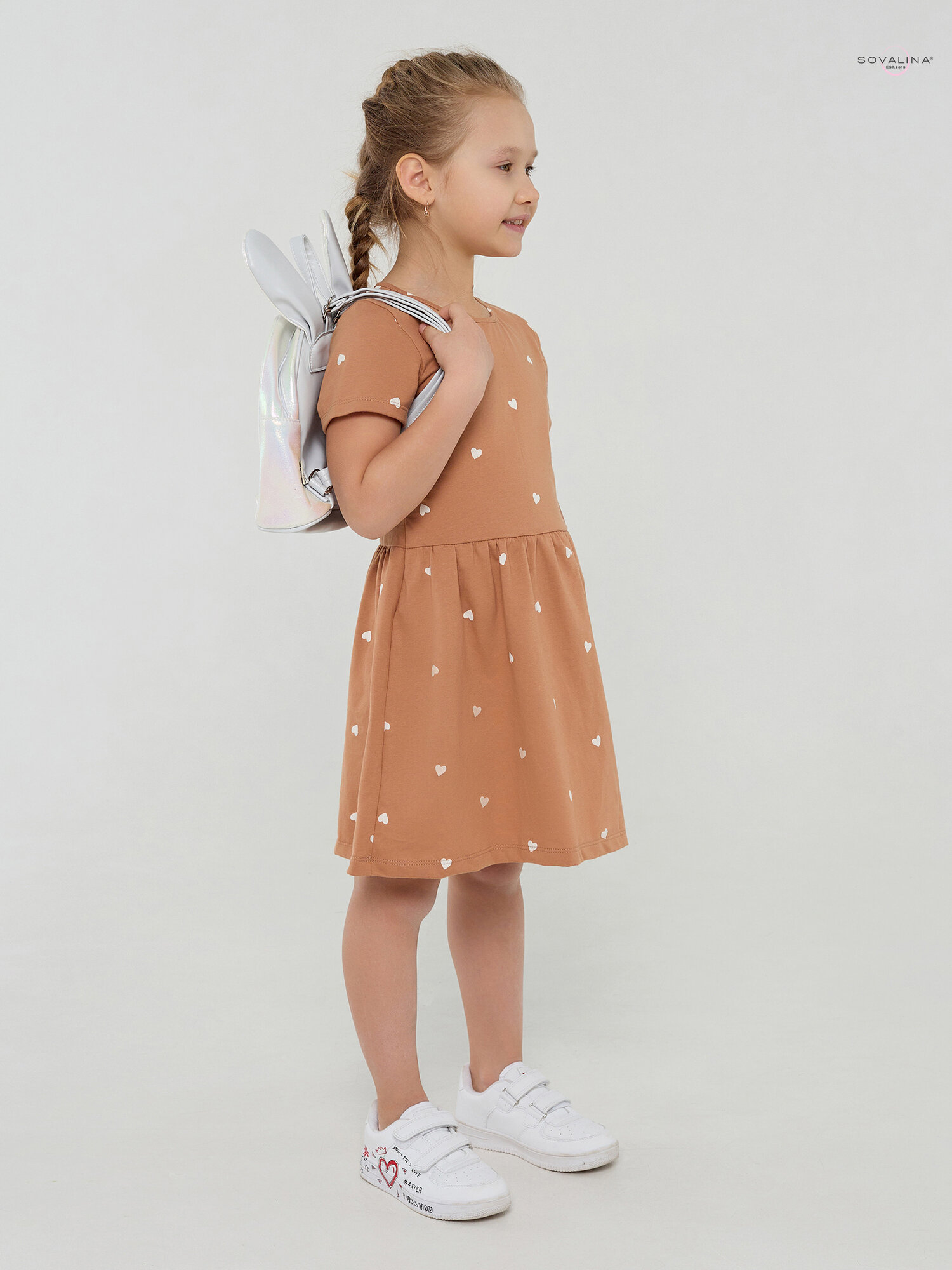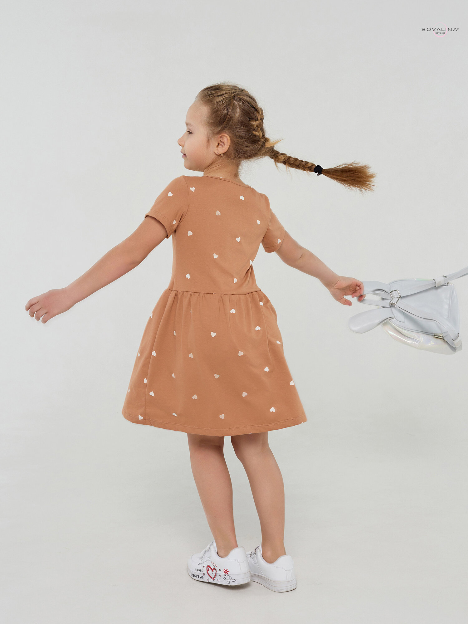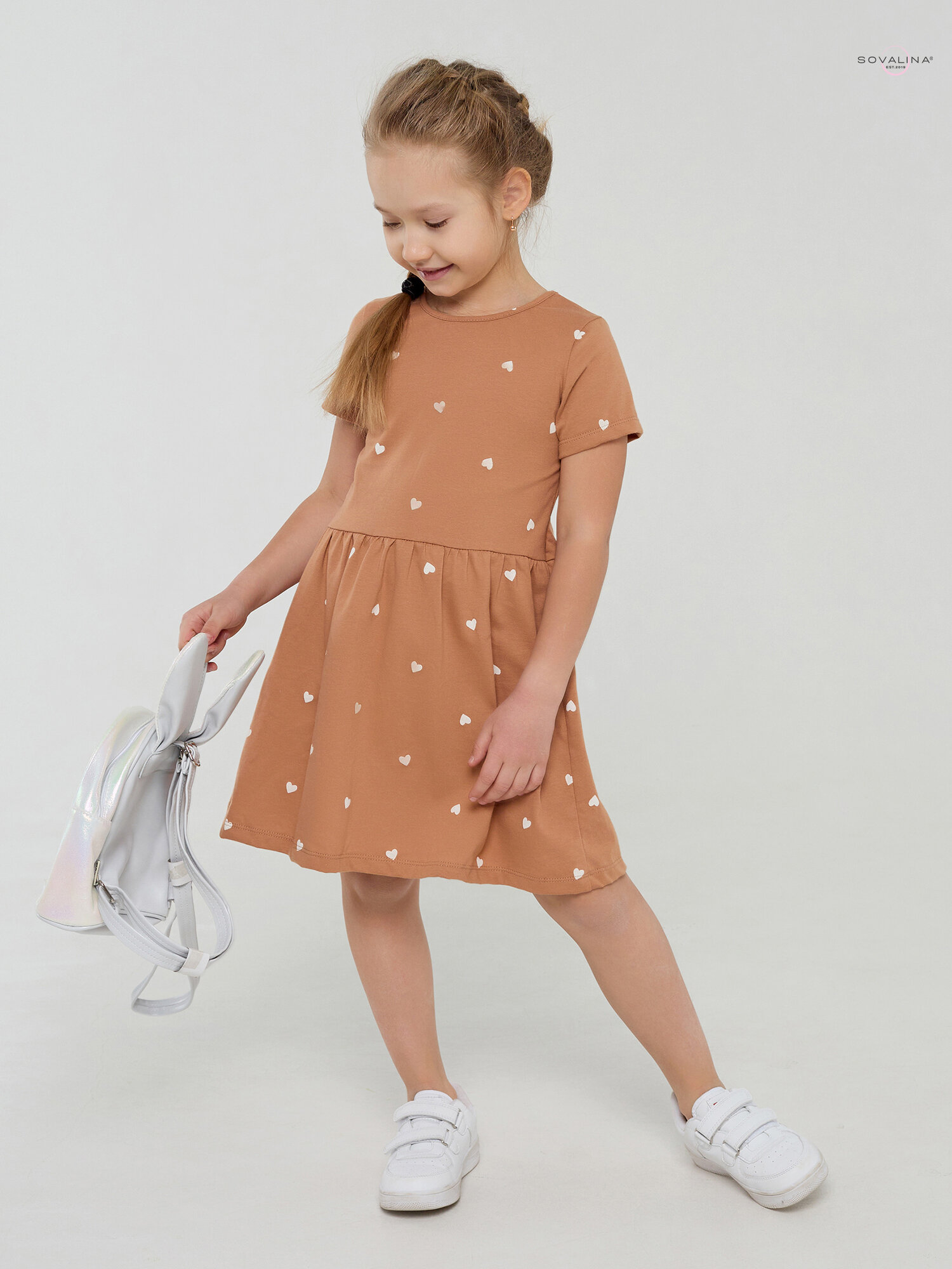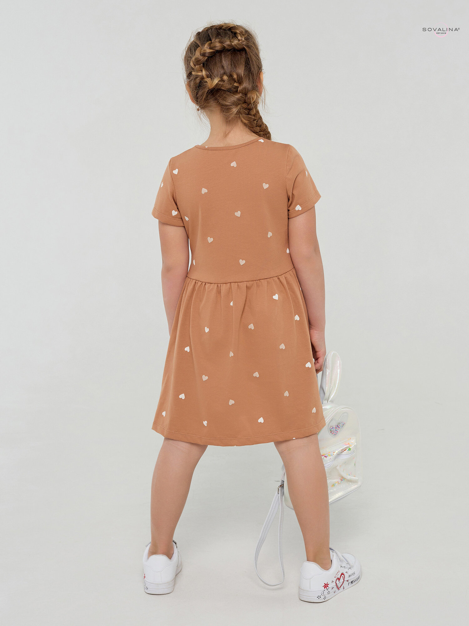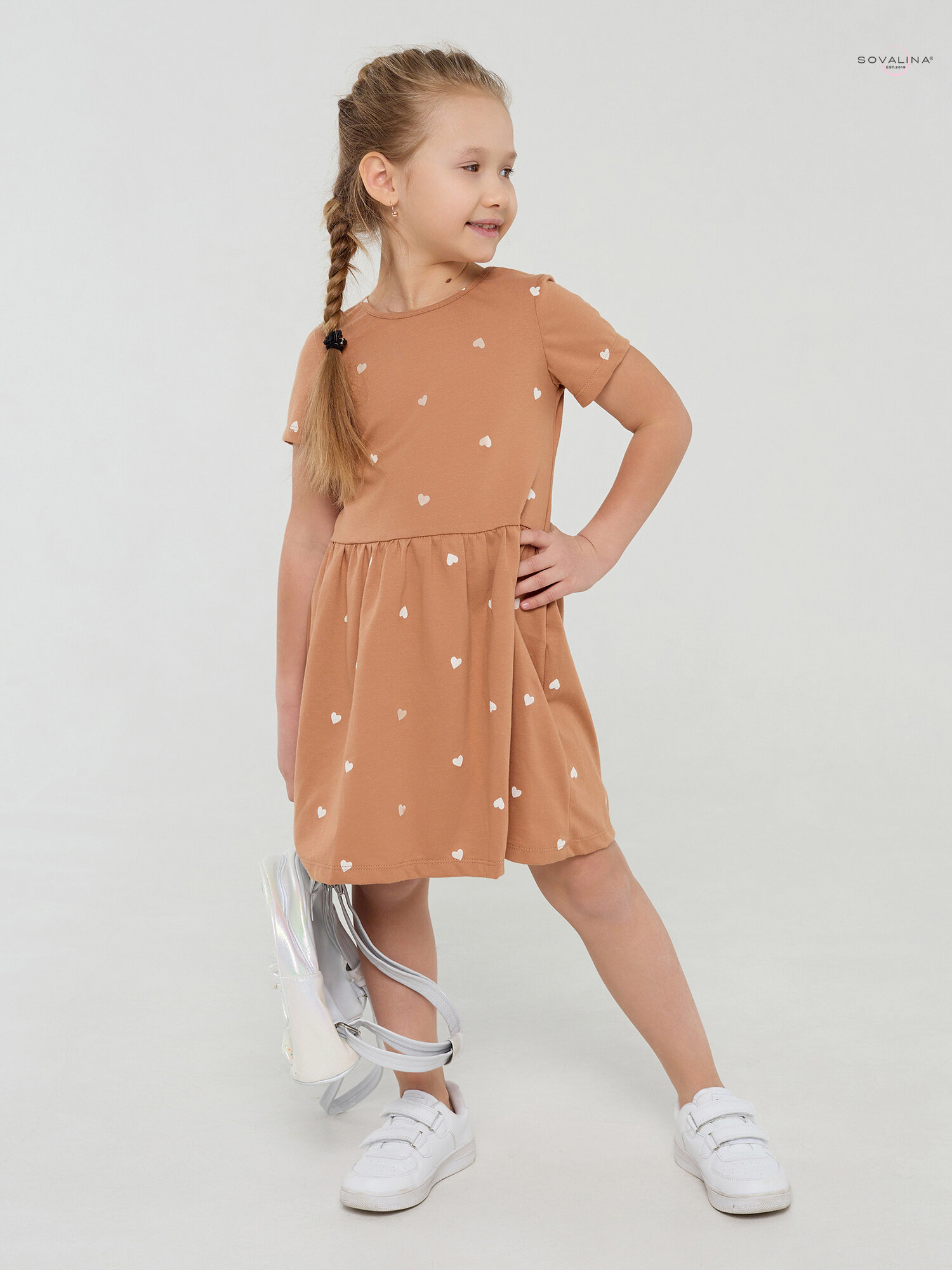 Платье для девочки SOVAlina Лето "Сердца на песочном, коричневое, размер 104