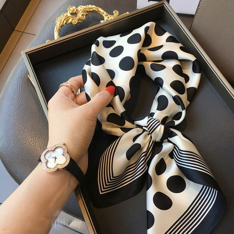 Женский атласный шелковый шарф платок на шею для волос для девушек в горошек 70*70 см. / Женская бандана д