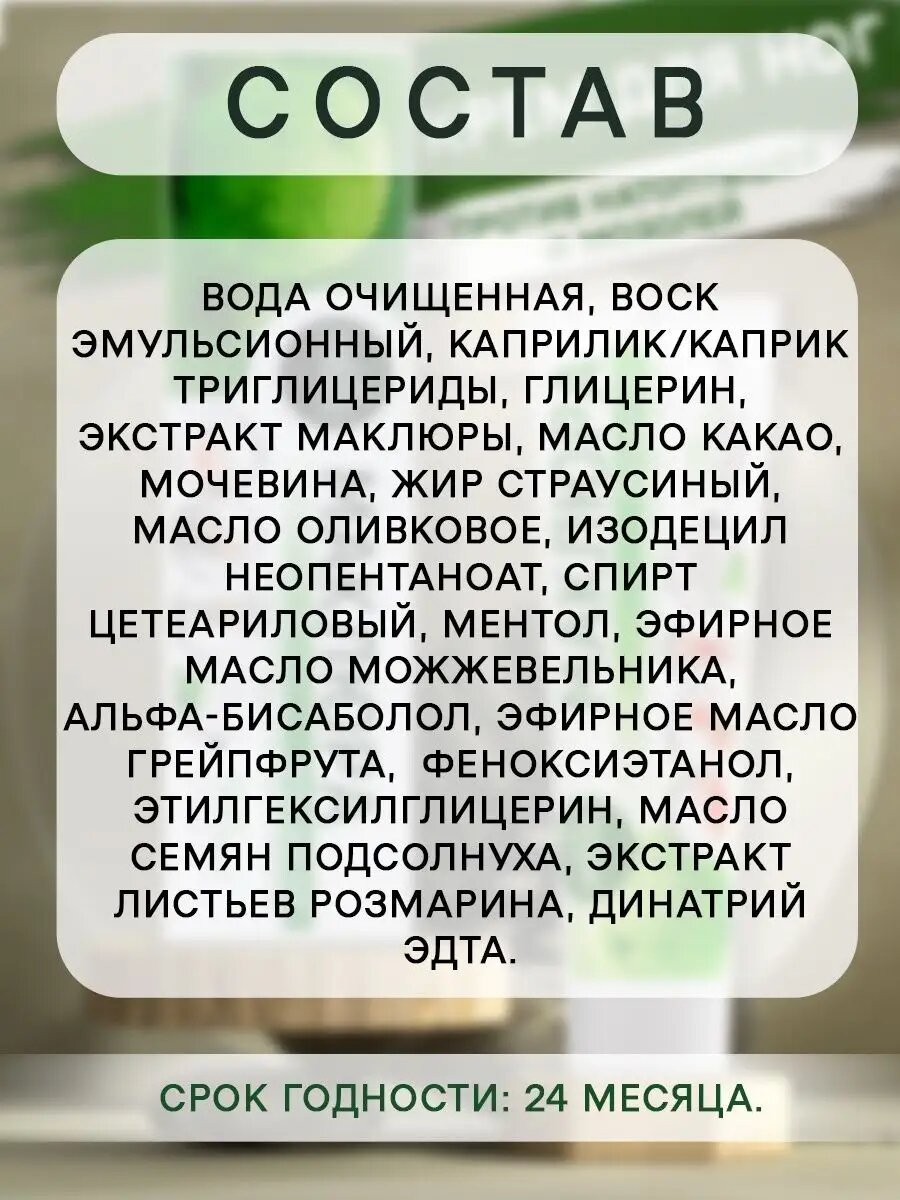 | Состав | Вода очищенная, воск эмульсионный, каприлик/каприк триглицериды, глицерин, экстракт маклюры, масло какао, мочевина, жир страусиный, масло оливковое, изодецил неопентаноат, спирт цетеариловый, ментол, эфирное масло можжевельника, альфа-бисаболол, эфирное масло грейпфрута, спирт бензиловый, метилизотиазолинон, метилхлороизотиазолинон, масло семян подсолнуха, экстракт листьев розмарина, динатрий ЭДТА. |
