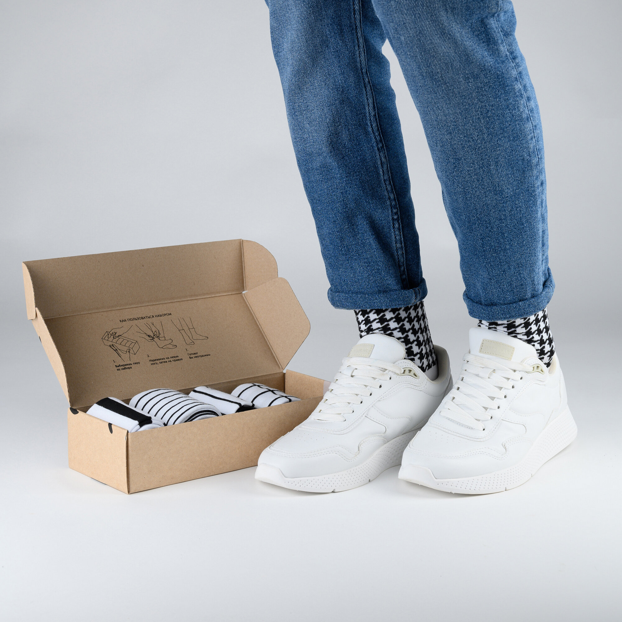 НС-5-203/2 Набор из 5 пар мужских носков "Нева-Сокс" белые желтые коричневые серые полоска ромб принт рисунок яркие цветные разноцветные повседневные длинные высокие средние хлопок хб хлопковые коробка комплект подарок